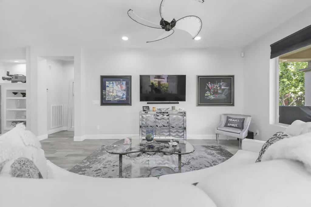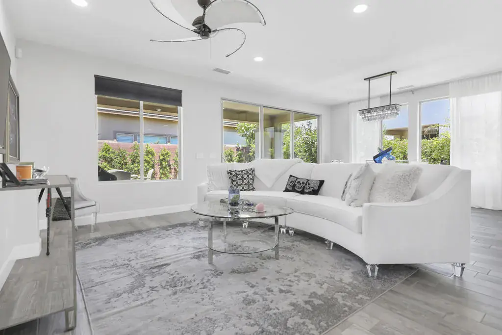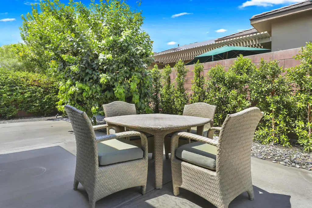 Highly upgraded, fully furnished, and equipped with solar, this turnkey residence is designed for both comfortable everyday living and effortless entertaining. Club membership is available for transfer, offering an estimated $17,000 in savings. The open-concept layout centers around a gourmet kitchen featuring high-end appliances, quartz countertops, a large quartz island, custom tile backsplash, and a built-in wine refrigerator. Expansive sliding panel doors open to the patio, creating a seamless indoor-outdoor flow. Interior highlights include an electric solar shade, a gas fireplace with tile detailing, recessed niches, upgraded recessed lighting, upgraded tile flooring, and added garage storage. A versatile den provides flexible space for media or lounging, while an additional flex area with a built-in desk functions well as a home office. The primary suite offers a private retreat with a custom walk-in closet accented by its own chandelier, a tiled walk-in shower with bench seating, dual vanities, and refined finishes throughout. The spacious laundry room is complete with a utility sink, extra cabinetry, and extended counter space. The backyard is a tranquil setting featuring a water feature, citrus trees, and a covered patio–well suited for enjoying the desert climate. An optional Polo Club membership is available for transfer, offering access to the clubhouse, state-of-the-art fitness center, resort and lap pools, tennis & pickleball courts, indoor golf simulator, dining at June Hill’s Table and more. The existing membership can be transferred to the buyer for a $3,000 fee at the time of purchase (compared to the standard $20,000 initiation fee, if purchased), buyer to pay monthly club dues of $240 in addition to the monthly HOA fee of $280. This is a refined opportunity to enjoy resort-style living year-round in one of Indio’s most desirable gated communities.