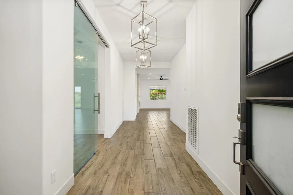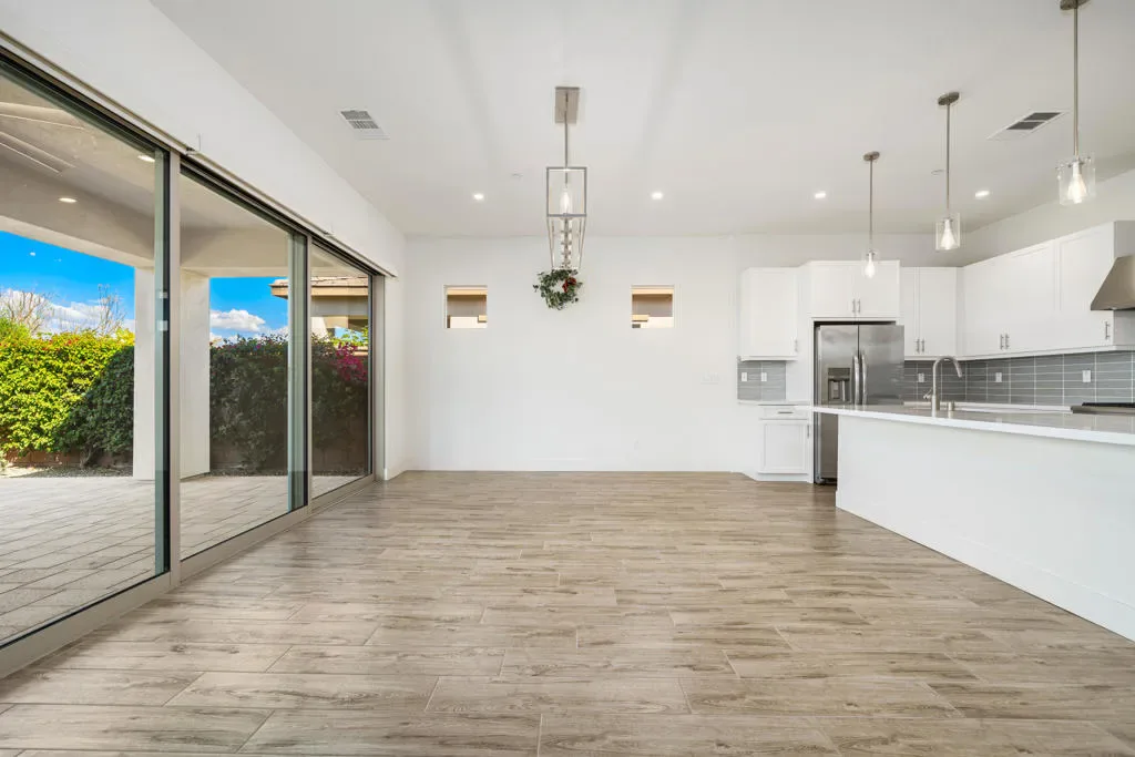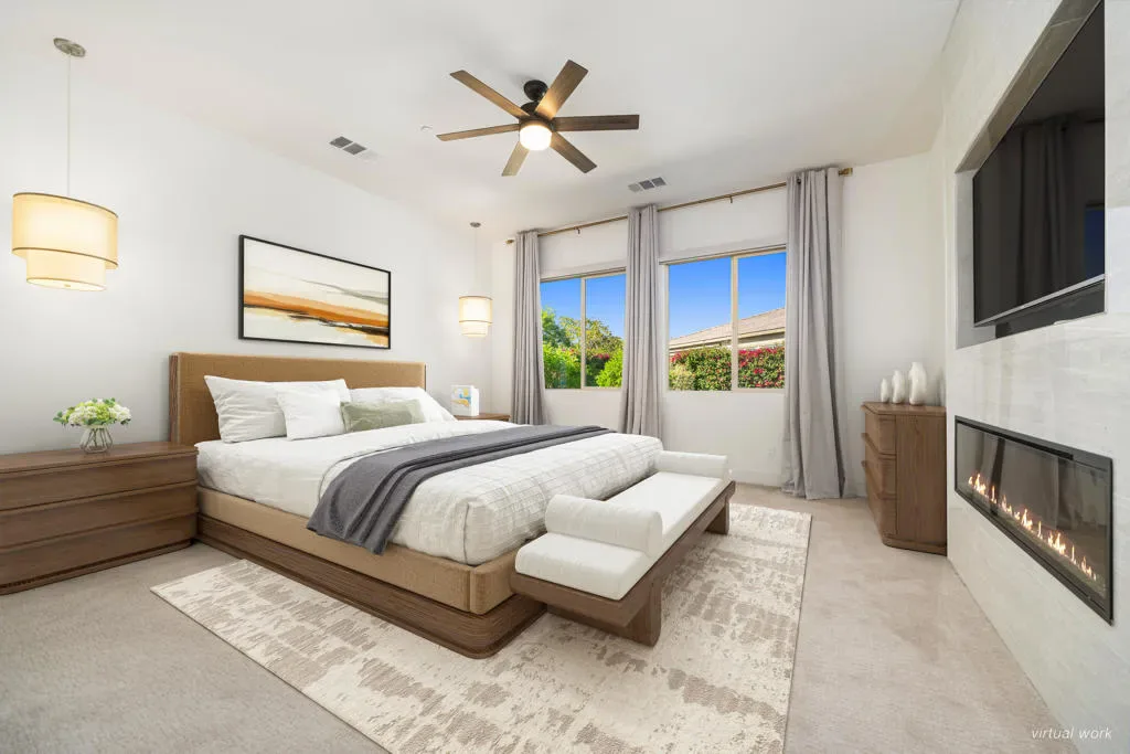 Life at the Trilogy Polo Club is among the finest in the Coachella Valley. This stunning contemporary Liberty model 2,357 square foot, 3-bedroom, 3-full baths home with office, is upgraded to the max. The quality and artful design of the home and natural beauty of the Polo Club resort makes every day living extraordinary. Once inside your greeted by 10 ft. ceilings, sparkling custom lighting, and inviting wide-plank tile floors. Off the hallway is an executive-sized room with tall custom glass doors perfect as an office, study or game room. The great room with a large linear fireplace, 70” big screen TV against a wall of marble is a great place to relax, read, and stream your favorite shows. The windows feature custom electric shades, and a 5-ton Lennox gas heating and cooling system with UV sterilization and whole house attic air filter keep air quality and temperature perfect year-round. A wall of triple glass sliding doors provides a seamless flow between indoor and outdoor living and entertaining. The beautifully landscaped private backyard with covered patio and ceiling fan is a peaceful place to enjoy by day. By night, watch the brilliant colors of the sunset and the landscape light up against the dark night sky. The gourmet kitchen is inspiring with an abundance of custom white shaker cabinets, radiant quartz countertops against a custom glass subway tile backsplash and grand center island with pendant lighting. Upgraded professional stainless appliances include a six-burner gas cooktop and custom range hood, new refrigerator, oven, microwave, and dishwasher. The generous size and pantry make it easy to keep all your cooking appliances neatly tucked away. The spacious primary bedroom is a luxury retreat, with a built-in linear fireplace and above and opening for a 70” TV. The sumptuous bath radiates luxury with quartz counters and a large walk-in shower with custom tiles to the ceiling. The walk-in closet is thoughtful in design with custom built-ins to accommodate even the most prolific shoppers. Two comfortable additional guest bedrooms are located away from the primary bedroom. One is an ensuite with a full bath and walk-in closet while the third guest bedroom with an adjacent full bath, could double as an office with built-in cabinets and shelves plus a closet. The laundry room is oversized with white shaker cabinets, washer, dryer and deep sink. The 2-car plus extra golf cart garage has an epoxy flooring and built-in tool chest and storage.