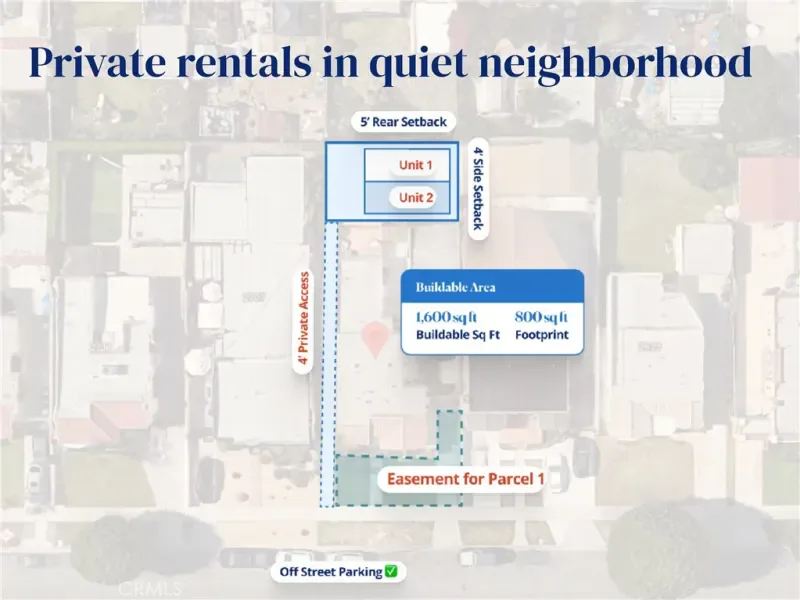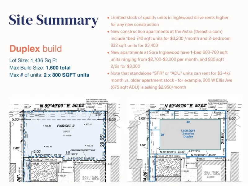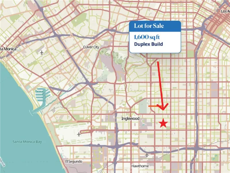 Build a new home. Flat, vacant, and ready to build up to 1,600 square feet (either a house or a duplex). Imagine, building your brand-new dream home for less than the cost of an old fixer. Or build a duplex and live in one unit and rent out the other. Land was subdivided from existing property using the CA HOME act, granting it special privileges to enable development: no hearings required, no costly parking required, and ministerial (fast) approval. Drop in a prefab or build custom from the ground up – the choices are endless. For rental comps, you can build two 800 sqft 2 bed/1bath units, each of which can rent for ~$3,000/month ($6,000/month gross). Walkable to 55-acre EdwardVincent Jr. Park, and under 2mi from SoFi Stadium. Inglewood’s booming with billions invested – now’s your chance to invest in this hot area.