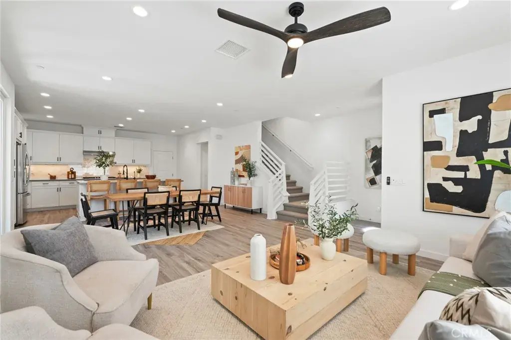 Located in the highly sought-after Cadence Park neighborhood, 101 Stage is a turnkey corner home that seamlessly blends modern luxury, privacy, and smart-home convenience. Equipped with cutting-edge technology, including an LG ThinQ refrigerator, Whirlpool Smart Oven, Leviton lighting system, Nest thermostat, Eero mesh internet, Ring doorbell, and Cove alarm system. This home offers comfort, connectivity, and security. A 220V garage outlet supports EV charging, while a whole-house fan ensures year round comfort. This residence features the largest and most popular Lyric floor plan by Tri Pointe Homes, with all three bedrooms and a den (easily convertible to a 4th bedroom) located on the same level. Although classified as a condo, it offers exceptional privacy with its own foundation and roof, plus an 8-inch air gap between neighboring homes. Abundant natural light fills the home, with no adjacent neighbor blocking the sunshine. The main living area flows effortlessly into the dining space and gourmet kitchen, showcasing a large center island, stainless steel appliances, quartz countertops, and ample cabinetry. Step outside to the sunny side yard featuring water-wise landscaping, a tranquil fountain, and space for outdoor dining, with no neighbor next door. The second floor hosts a spacious primary suite with high ceilings, custom window treatments, a walk-in closet, and an en-suite bath, along with two additional bedrooms, a secondary bath, laundry room, and flexible den/office/4th bedroom option. The third floor is ideal for entertaining, offering a large loft that opens to a covered terrace with expansive views. Additional highlights include a tankless water heater, dual AC systems (including a split system on the third floor), and an oversized two-car garage. Ideally located in the heart of Great Park, residents enjoy access to seven pools, playgrounds, BBQ areas, walking and biking trails, and the 194-acre Sports Park. Shopping, dining, and freeway access are nearby, along with low HOA dues, award-winning Irvine Unified schools, and close proximity to the Cadence Park pool, sports courts, and Cadence K–8 school. This exceptional home offers the perfect blend of modern amenities and vibrant community living, an opportunity not to be missed.
