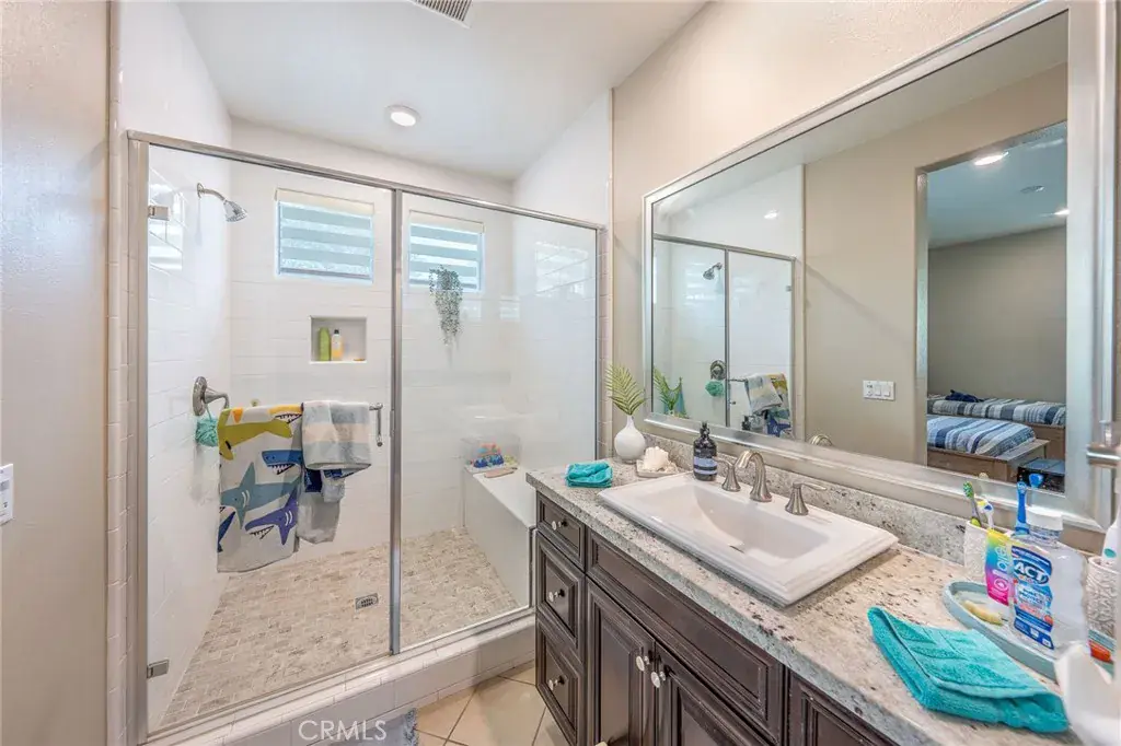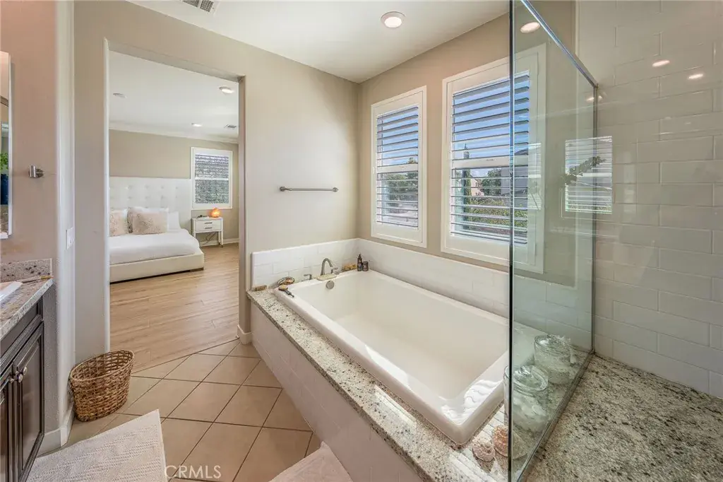 Designer-selected finishes elevate the home, including luxury tile flooring extending from the kitchen through the sliding doors to the California Room, creating a seamless indoor-outdoor living experience. Energy-efficient features help maintain year-round comfort while enhancing savings.