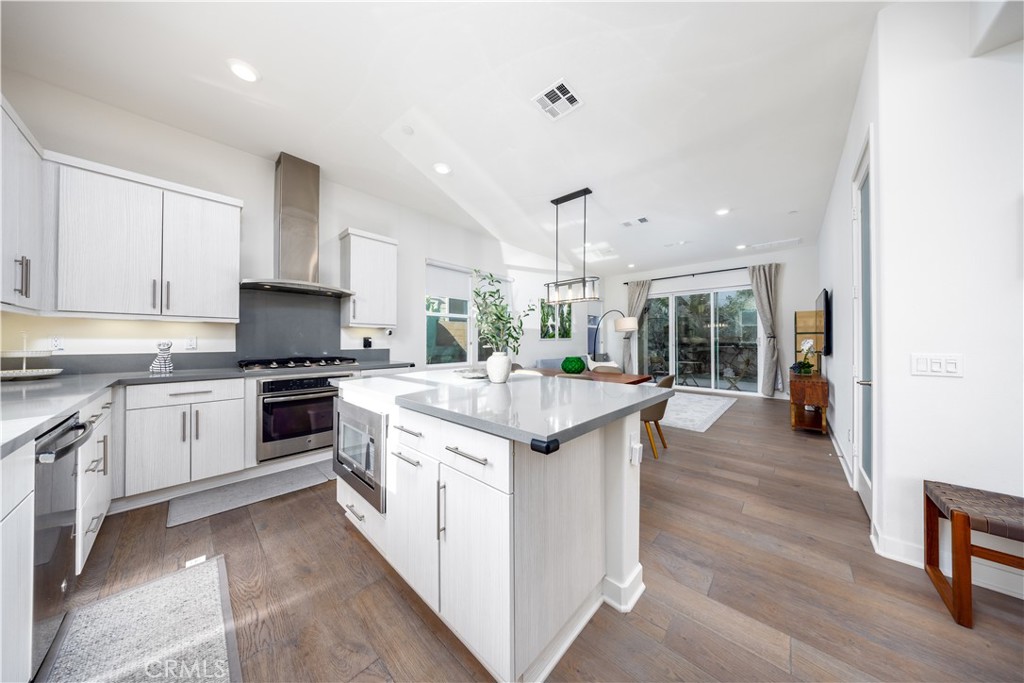 The kitchen includes quartz countertops, a large center island, stainless steel appliances, and ample cabinetry.
