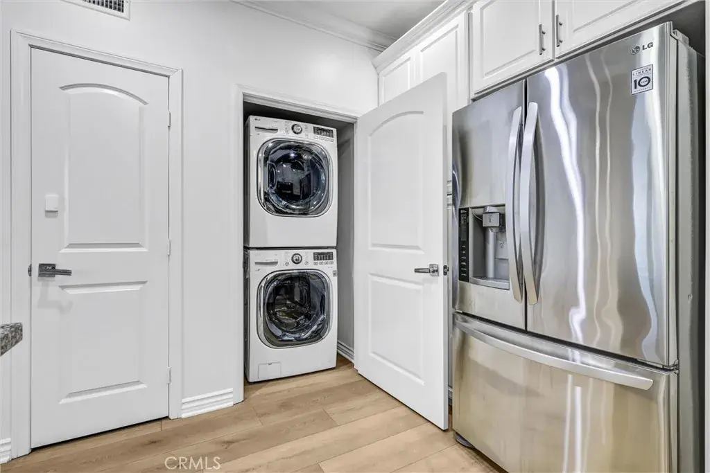 It comes with one car attached garage and one covered carport space. Washer, dryer and refrigerator are included for your convince.
