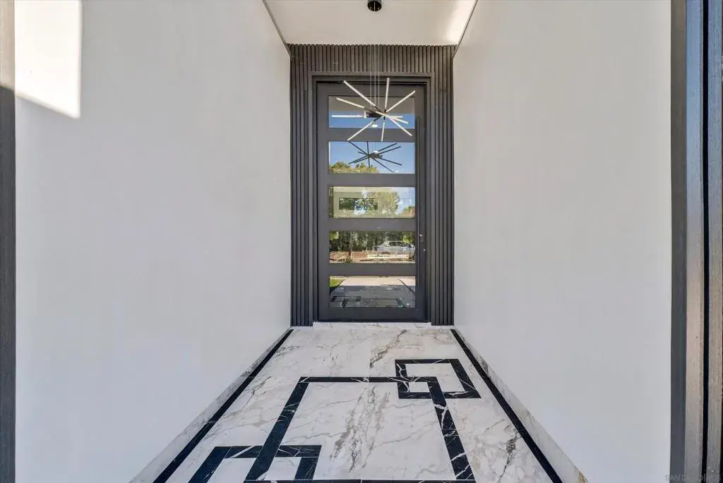 A stunning architectural masterpiece blending modern design with luxury comfort. This fully renovated single-story home showcases soaring ceilings, sleek porcelain floors, and an open-concept great room that flows seamlessly to an entertainer’s patio through massive glass doors. The gourmet kitchen features custom cabinetry, waterfall marble counters, and designer lighting. The primary suite offers a spa-inspired bath with freestanding tub, rainfall shower, and LED backlit mirrors, plus a custom-built walk-in closet. Every detail—from the linear LED fixtures to gold-accented hardware—reflects sophisticated craftsmanship. Low-maintenance landscaping, sleek curb appeal, and a modern glass garage door complete this exceptional residence—perfectly designed for today’s lifest