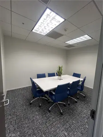Suite 320: Furnished suite – reception area, conference room, large open area, open kitchen, and IT board.