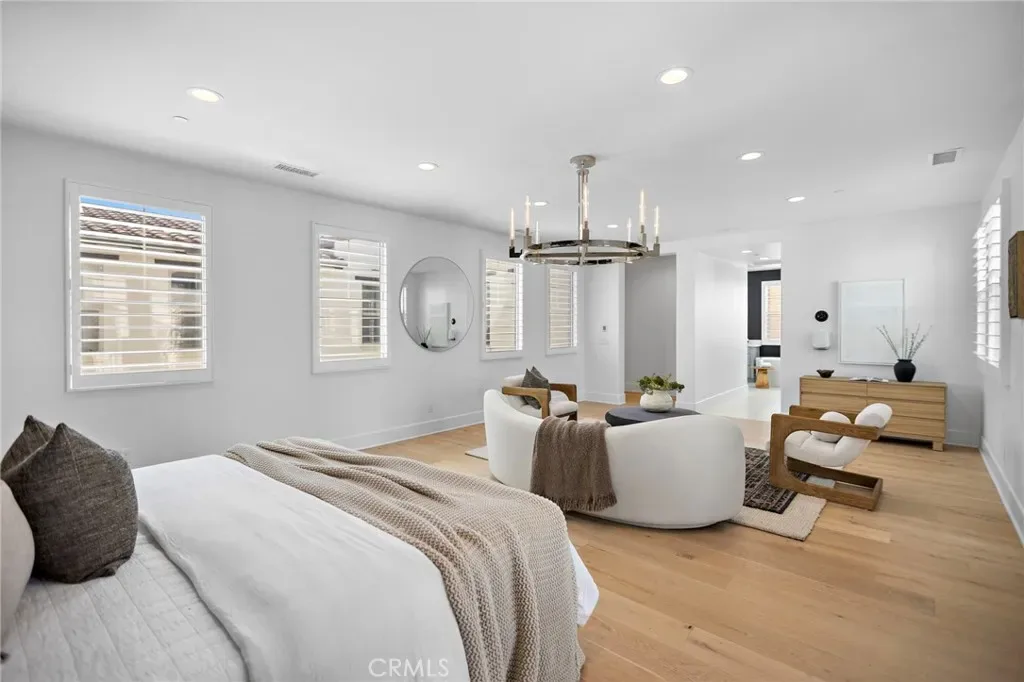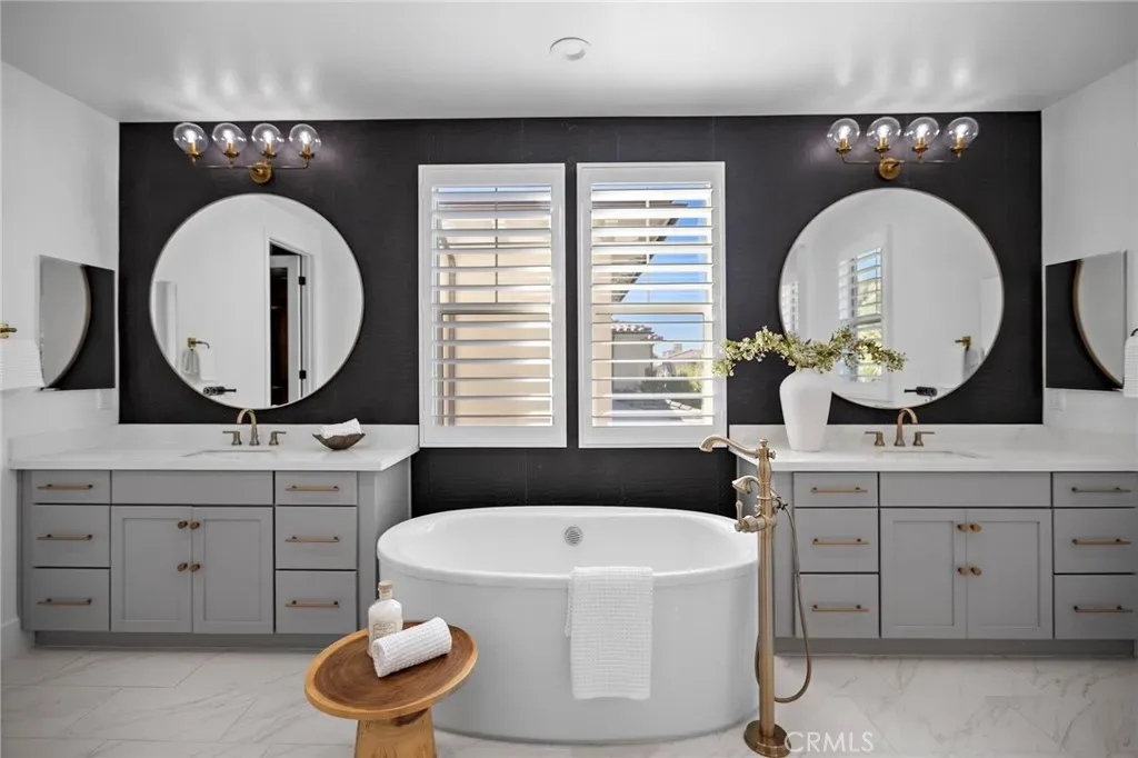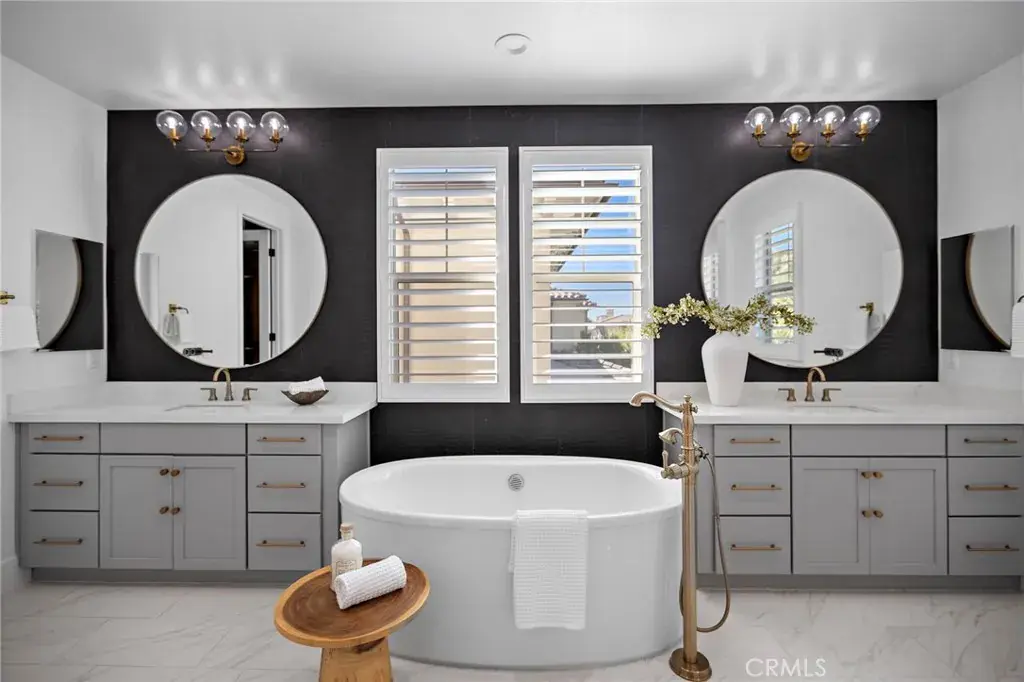The luxurious primary suite includes a builder extension, spa-like bathroom with marble-style surrounds, custom wallpaper, and gold fixtures; along with a fully customized primary closet reimagined by Studio Sean Design for elevated functionality and design.
