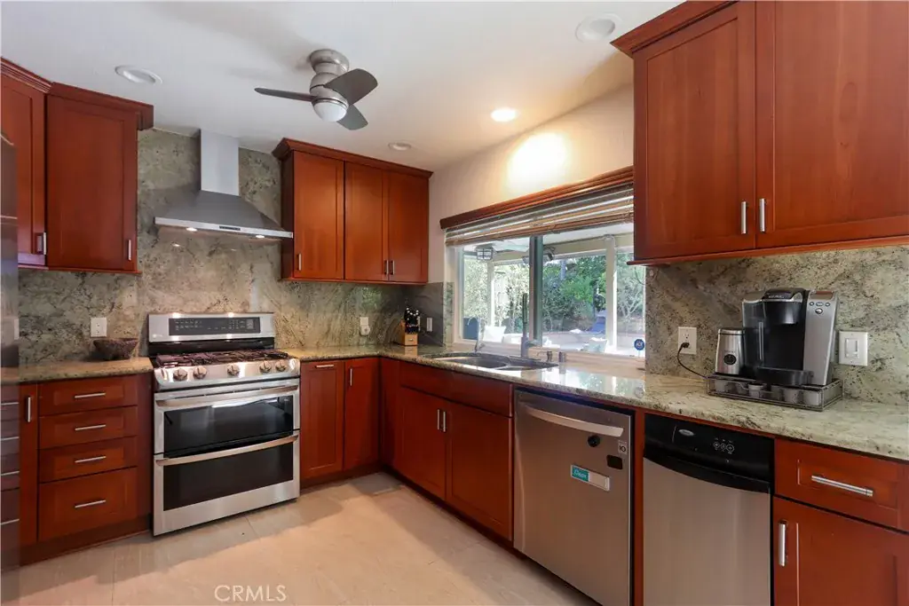 Step outside to an approximately 400 square foot covered patio designed for true indoor outdoor living. Complete with heaters, fans, and remote controlled blinds, this expansive space extends the home and is perfect for entertaining or year round enjoyment. Mature fruit trees and a dramatic wall of tall cypress create rare privacy and a tranquil garden setting. An expanded extra wide driveway and walkway enhance curb appeal and convenience.