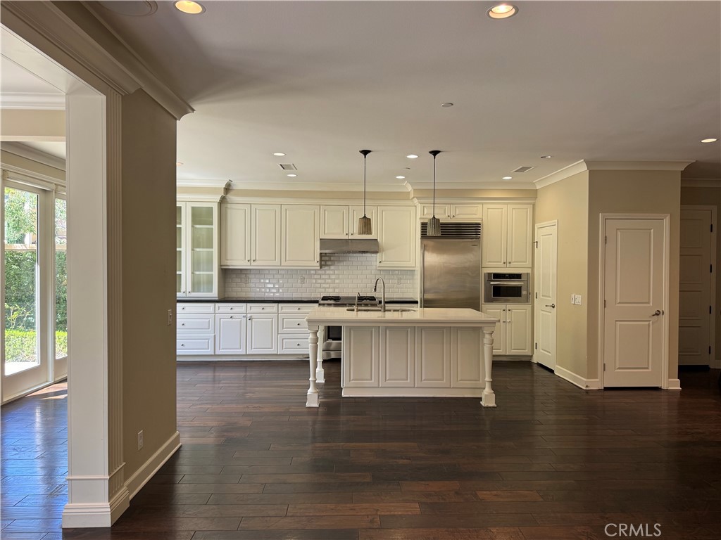 At the heart of the home is a highly upgraded gourmet kitchen, beautifully appointed with granite countertops, a full designer backsplash, elegant glass-door cabinetry, and two stylish pendant lights that add warmth and ambiance. Premium appliances include a Sub-Zero refrigerator and a built-in wine cooler—perfect for the culinary enthusiast. The kitchen opens seamlessly to the inviting family room, creating a bright, airy great room.