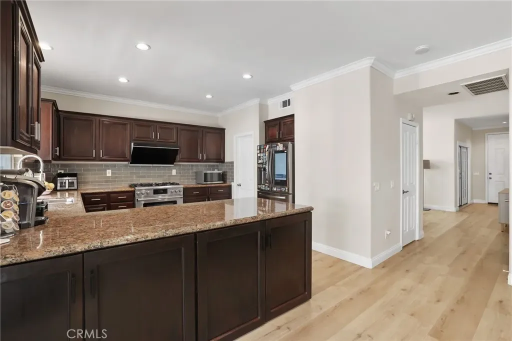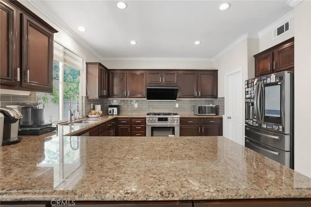 * Chef’s Kitchen: Boasts solid granite countertops, a full mosaic tile backsplash, a peninsula island, and a walk-in pantry.