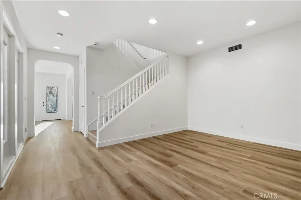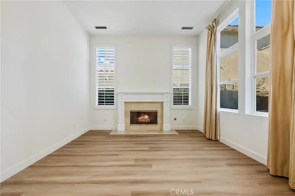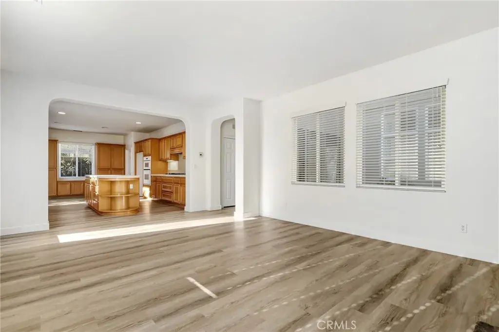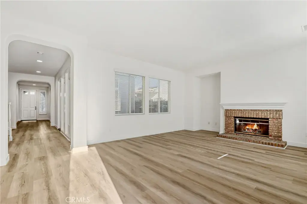 Recent upgrades include new paint throughout, new blinds, and new luxury vinyl flooring—no carpet anywhere. The open-concept layout connects the family room and kitchen, complemented by separate formal living and dining rooms. Both the formal living room and family room feature cozy fireplaces.