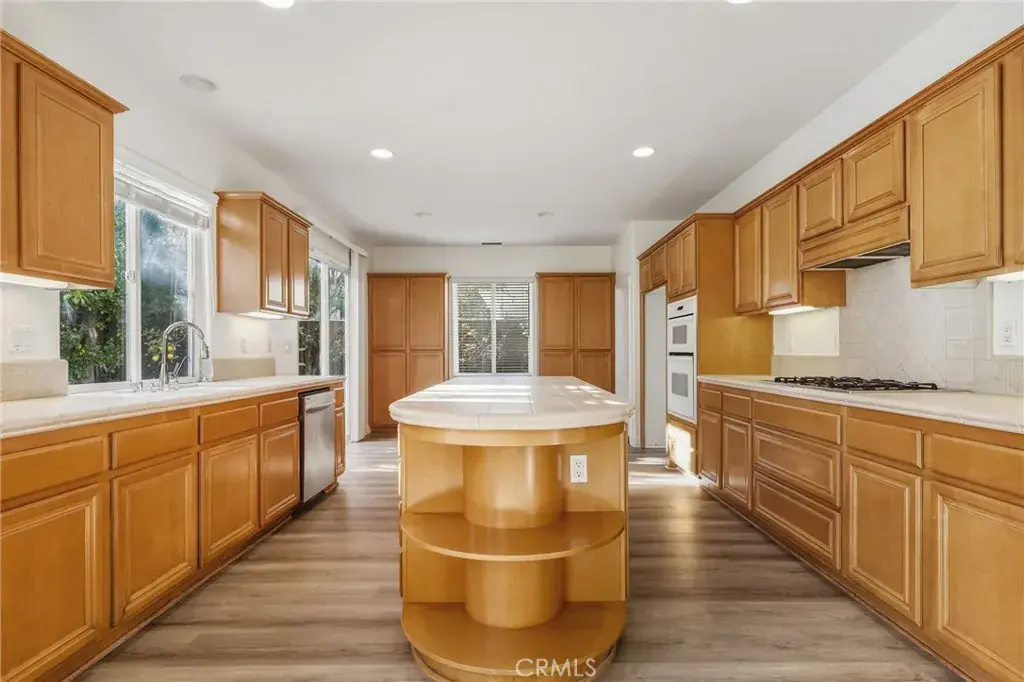 The kitchen includes a large center island, breakfast nook, backyard access, and direct entry to the garage. Upstairs, the oversized primary suite offers an en suite bath with dual sinks, a separate tub and shower, vanity area, and walk-in closet. Two additional bedrooms, a full hallway bathroom, an inside laundry room, and a versatile loft complete the upper level.