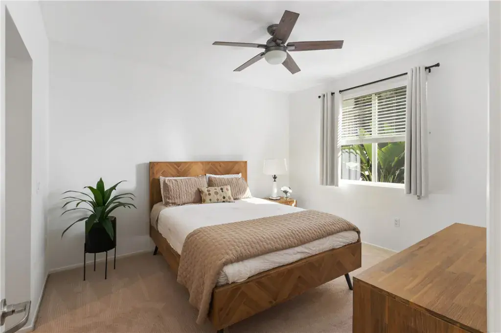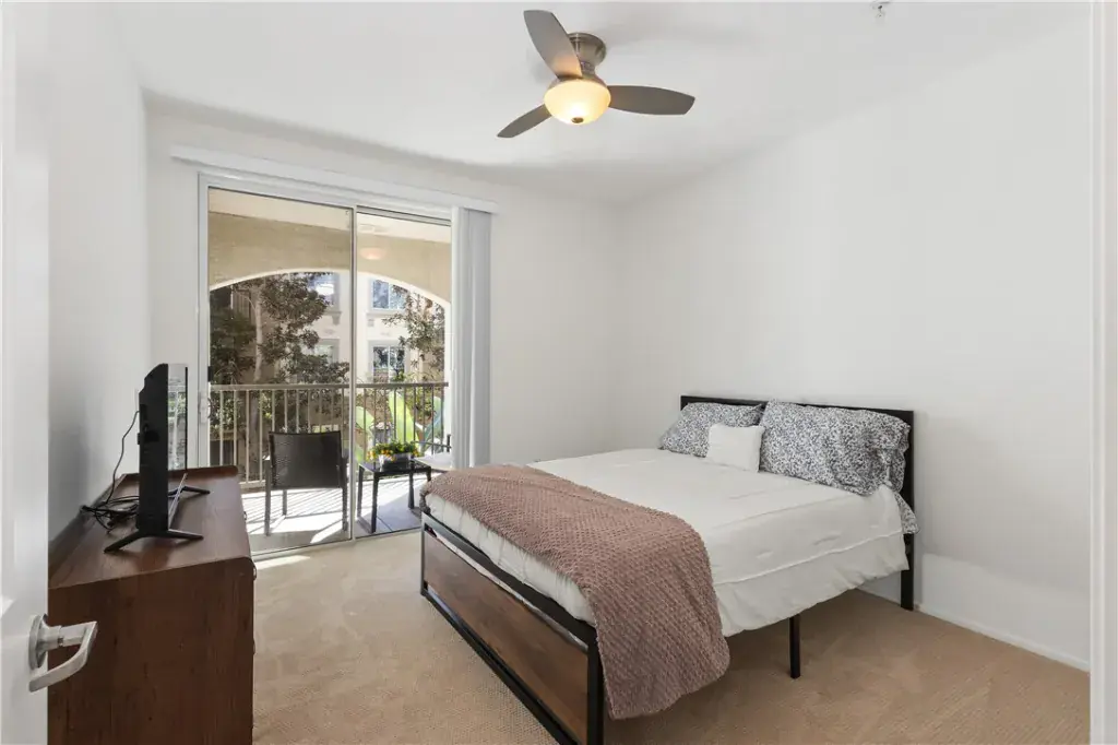 The inviting living area features a door leading to your private patio, while the second bedroom offers its own sliding door entrance—creating a perfect indoor-outdoor flow overlooking a peaceful greenbelt. The primary suite serves as a private retreat, complete with custom closet built-ins and an upgraded glass shower. Beyond the unit, Avenue One offers a premier resort lifestyle featuring a sparkling pool, soothing spa, ample EV charging stations, and guest parking. The clubhouse is packed with amenities, including a fitness center, a covered basketball court, and a business center with quiet study rooms. You’ll enjoy being just minutes from UCI, John Wayne Airport, vibrant dining, world-class shopping, and easy 405/73/55 freeway access.