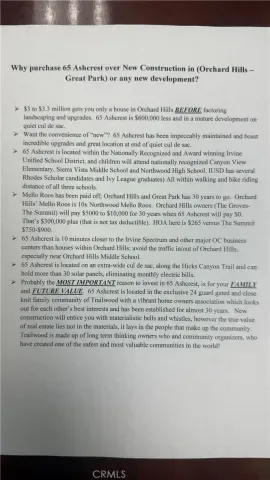 Thinking about buying brand-new construction? Read this first. Before you pay extra taxes, higher HOA fees, and wait months for completion, take a look at 65 Ashcrest. Welcome to 65 Ashcrest, a rare opportunity to own a spacious, beautifully appointed residence in the exclusive 24-hour guard-gated community of Trailwood. Combining timeless design, natural light, and an established neighborhood setting, this home offers the lifestyle many buyers hope to find—but rarely do. Spanning approximately 3,000 square feet, this thoughtfully designed home features 5 bedrooms plus a private office and versatile loft, along with 4.5 bathrooms, including a highly desirable main-level guest suite ideal for multigenerational living or visiting guests. An east–west orientation fills the home with warm natural light throughout the day, enhancing the open living spaces and creating an inviting atmosphere for both everyday living and entertaining. The surrounding community is known for its mature landscaping, tree-lined streets, and tranquil ambiance—a refreshing alternative to newly built developments. Residents of Trailwood enjoy access to two resort-style swimming facilities, including one within the guard gates and another at nearby Meadwood Park, offering exceptional recreation just moments from home. Located within the National Blue Ribbon Award–winning Irvine Unified School District, the home is also uniquely positioned with all three neighborhood schools less than one mile away, making daily life both convenient and connected. Adding to the community’s charm is the beloved annual Trailwood Harvest Festival, where residents gather for games, bounce houses, a petting zoo, face painting, and complimentary food—creating a true neighborhood experience that is increasingly rare. With no Mello-Roos taxes, HOA dues under $300 per month, and the security and prestige of a guard-gated enclave, 65 Ashcrest offers a compelling blend of value, luxury, and community. A home where elegance meets lifestyle—welcome to Trailwood.