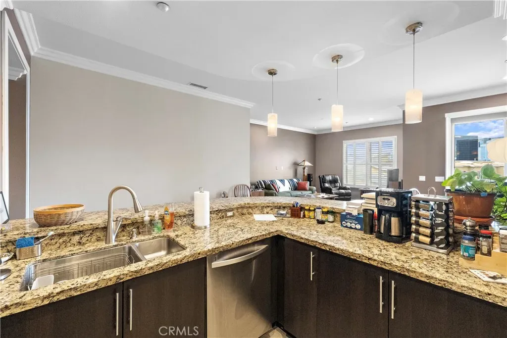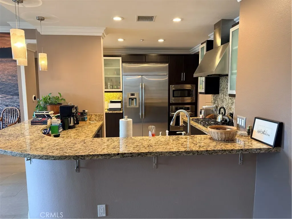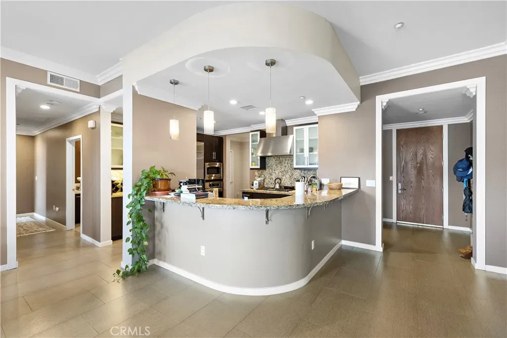 The open-concept floor plan seamlessly connects the living room, dining area, and gourmet kitchen, creating an inviting environment for both everyday living and entertaining. Large windows and recessed lighting fill the home with natural light, while the elevated penthouse position enhances privacy and tranquility. The chef-inspired kitchen features granite countertops, stainless steel appliances, large capacity refrigerator, and extensive cabinetry, with a breakfast bar that opens naturally into the living and dining areas.