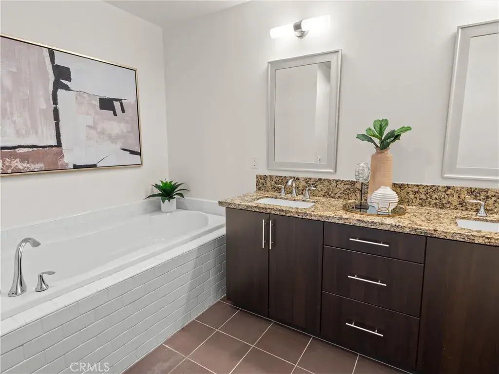 Bedrooms are Positioned on Opposite Sides of the Home, Creating Separation Between the Primary Suite and Secondary Bedroom. The Primary Bedroom Includes Multiple Closets and an En-Suite Bathroom with Dual Sinks, a Soaking Tub, and a Glass-Enclosed Shower. The Second Full Bathroom is Located Near the Secondary Bedroom and Includes a Tiled Vanity and Tub/Shower Combination.