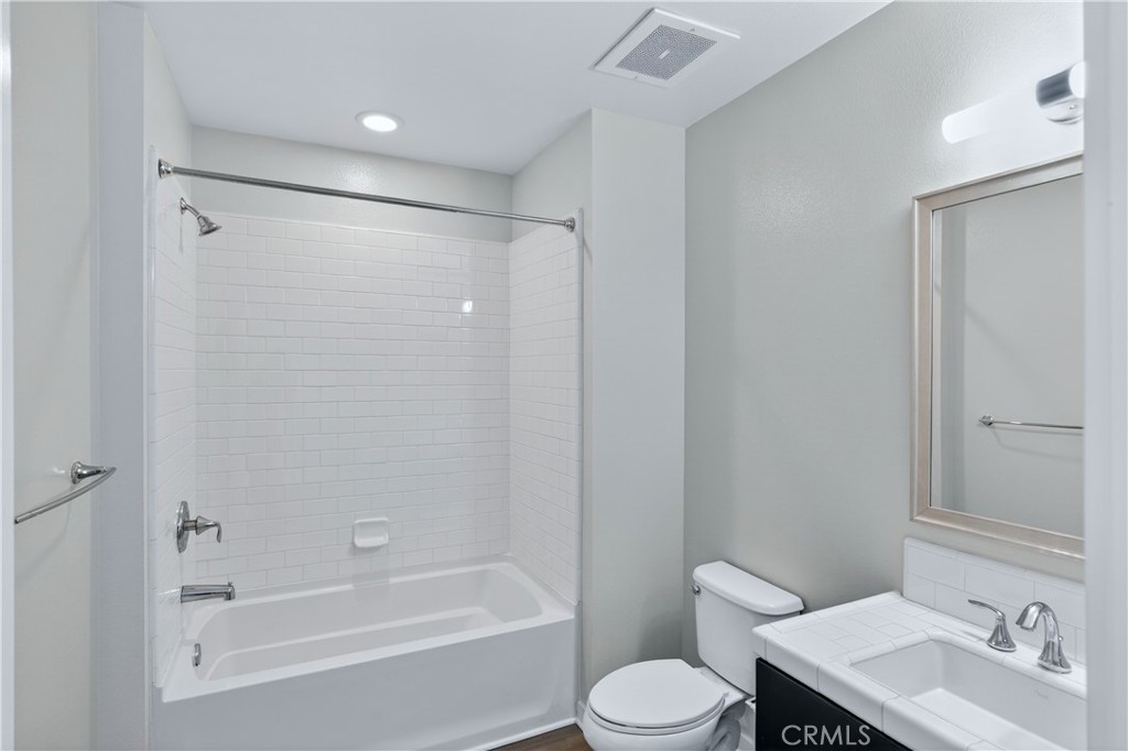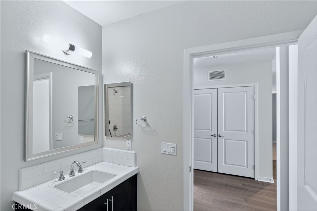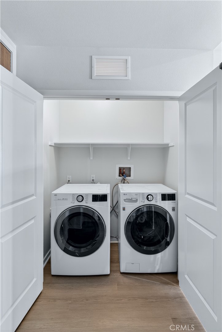 The primary suite features a walk-in closet with mirrored doors and a well-appointed en-suite bath with a walk-in shower. The secondary bedroom is complemented by a full bathroom with a tub, ideal for guests or additional living flexibility. An in-unit laundry area with washer and dryer adds everyday convenience.