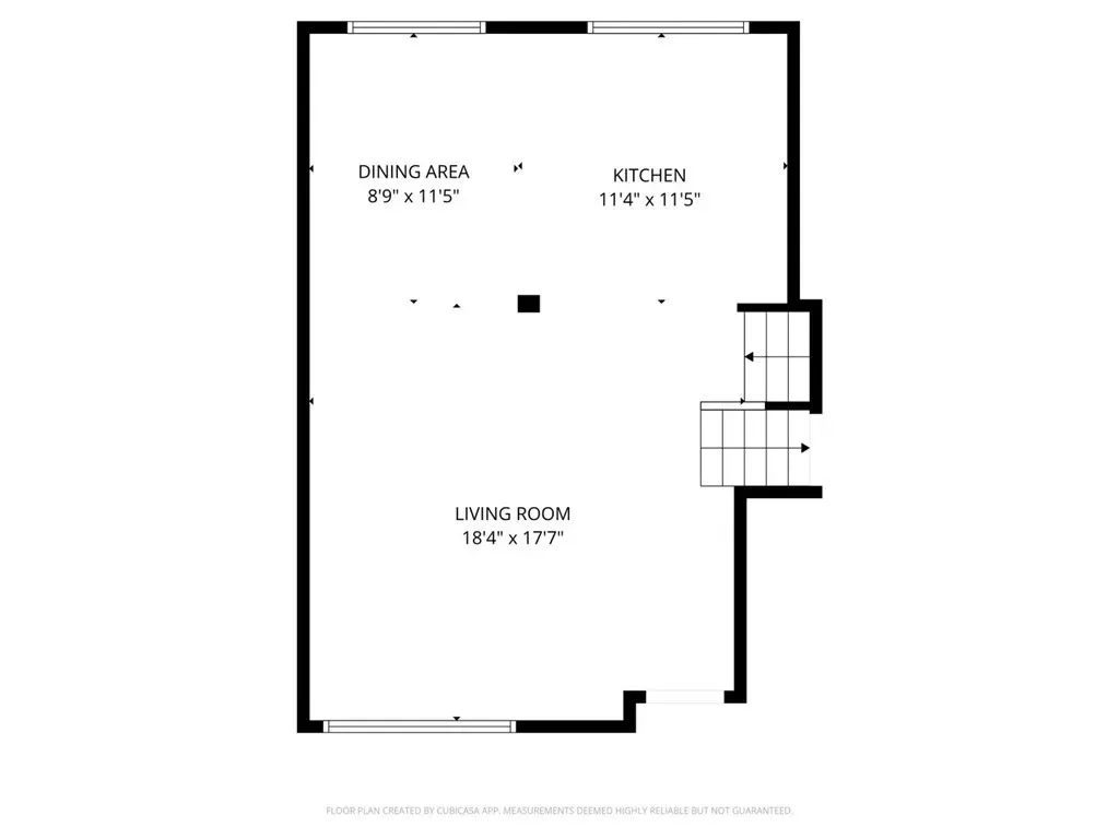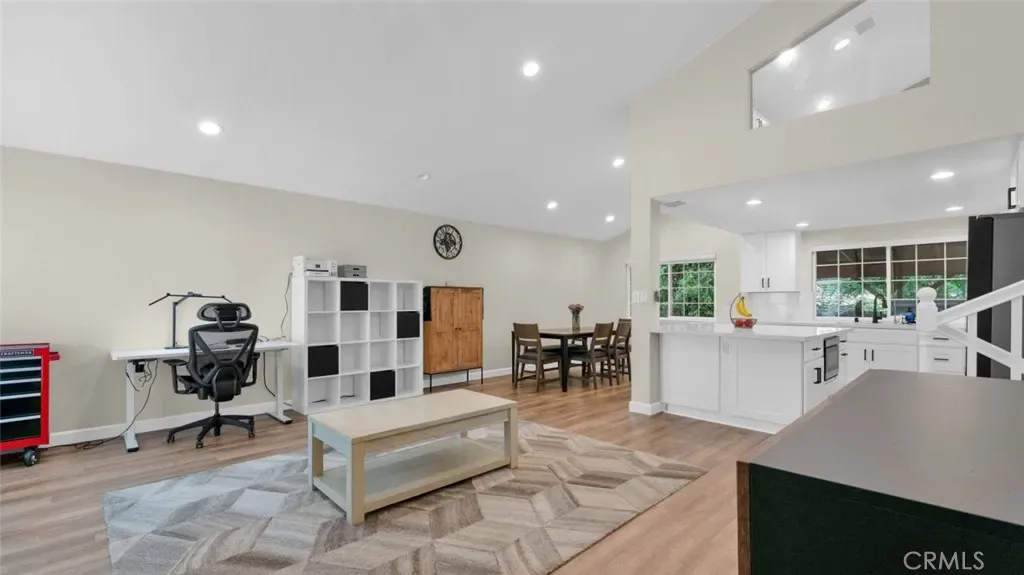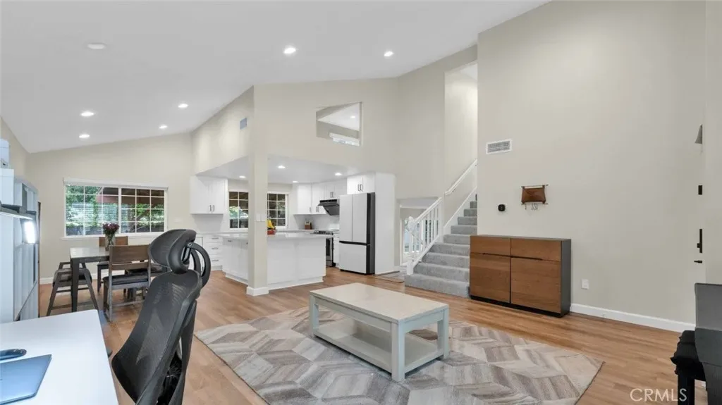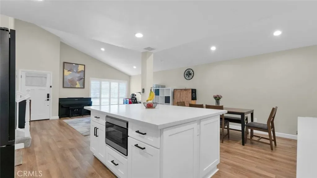 The main living space features soaring ceilings, abundant natural light, and a seamless flow into the dining area and fully remodeled kitchen. The kitchen showcases modern white cabinetry, sleek quartz countertops, stainless steel appliances, and a large center island, ideal for gatherings and meal prep.