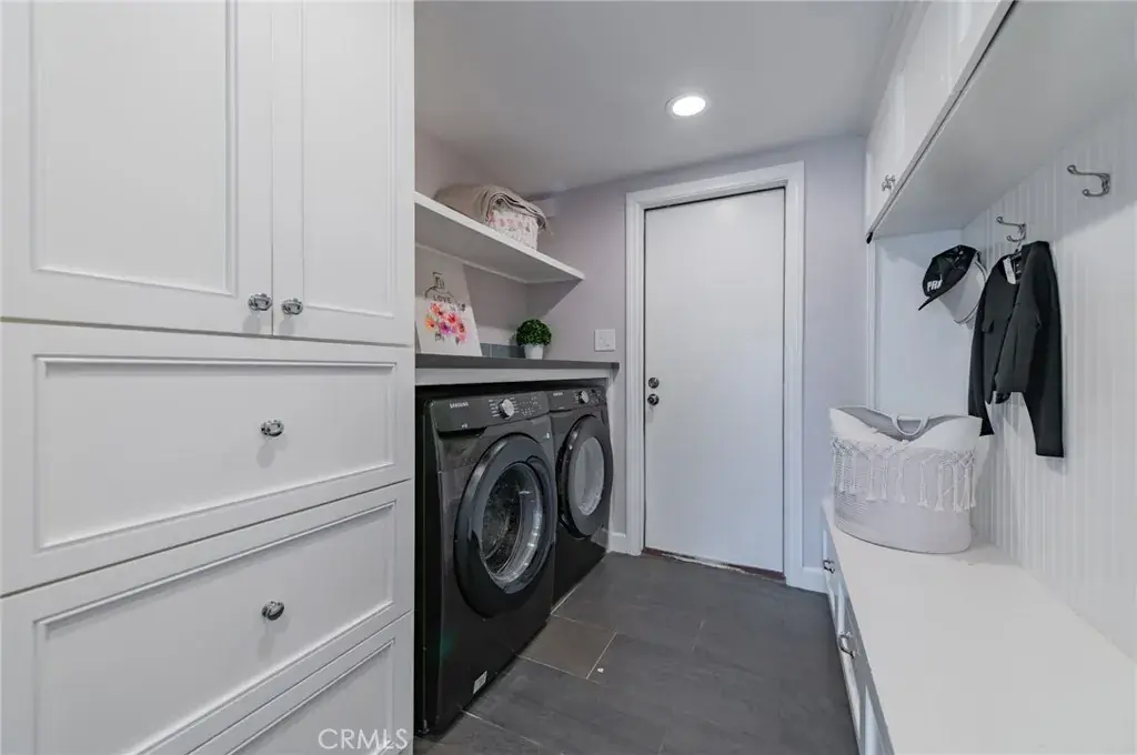 Adjacent to the family room is an upgraded full bathroom on the main level with modern tile and a frameless walk-in shower. Nearby, a functional zone leads to the garage and includes a laundry area and a built-in drop zone with integrated storage, hanging space, and a bench for added organization and convenience.