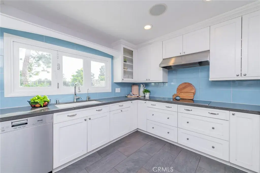 The upgraded kitchen features stainless steel appliances, custom cabinetry, and a bi-fold window above the sink that enhances ventilation, natural light, and connection to the outdoors. The backyard enjoys a seamless visual connection to the community greenbelt and tennis courts, while floor-to-ceiling glass in the dining area and French doors bring lush greenery indoors and enhance the home’s bright and inviting ambiance.
