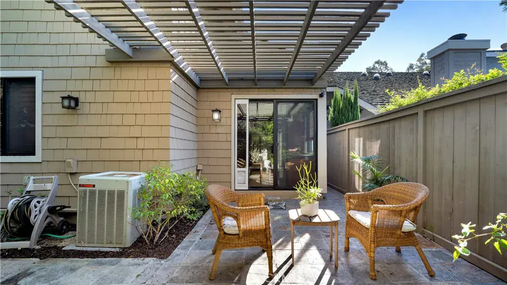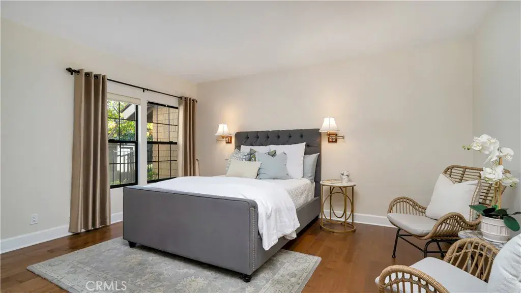 A rare jewel single-story home is one of the most beautiful on the market this year! Freshly painted inside and out, it boasts an airy, modern feel thanks to opened walls and high ceilings. Warm and inviting Boho style with natural cherry hardwood throughout. The home is surrounded by a private wrap-around garden and patio-an unusually large side yard. The interior was re-designed in 2013 by an exceptional finish carpenter with great attention to detail and smooth plaster walls and ceilings.. Dramatic high ceilings, square corners, modern baseboards, and dramatic columns give the Ashford design by Cark Akins its timeless contemporary look. Slate and wide-plank hardwood floors run throughout with a touch a slate in the entryway/foyer. The spacious kitchen dazzles with abundant storage, quartz counters, and thoughtful custom details, along with premium appliances – a Samsung French door fridge, Whirlpool dishwasher, Frigidaire dual wall ovens, and a 5-burner gas cooktop. The slate fireplace has both gas logs and may burn wood and is enhanced with built-in cherry shelves and bookcases. The “Great Room” is the perfect place to relax with garden views from wide windows and doors. Custom dual pane sliding doors open to the private patio. Both bathrooms have been remodeled with stone an quartz including an over-sized walk-in shower in the primary suite. Custom lighting has been added throughout. The garage has been finished by adding: epoxy floor, smooth walls, storage cabinets, a sectional roll-up door, and a custom attic above. Located in the picturesque Pinewood neighborhood—famous for its winding road and magnificent trees—residents enjoy a neighborhood pool, jacuzzi, park, volleyball court, and picnic area in the center. With festive holiday decorations and friendly gatherings, it’s a wonderful place to make friends and truly feel at home. The Woodbridge Village Association has recreation amenities that are unmatched in their breadth and scope when compared to similar private Homeowner Associations. The amenities include 2 landmark lakes with docks, 2 beach lagoons, 22 pools, 16 spas, 13 waders, 24 tennis courts, a splash pad, numerous parks with play equipment, volleyball courts, a big wheel park, horseshoe facilities, a fitness course, and much, much more. All told, the Association owns and operates 41 recreational facilities. The Irvine unified School District is one of the best in the Nation. Woodbridge is a wonderful place to call Home!