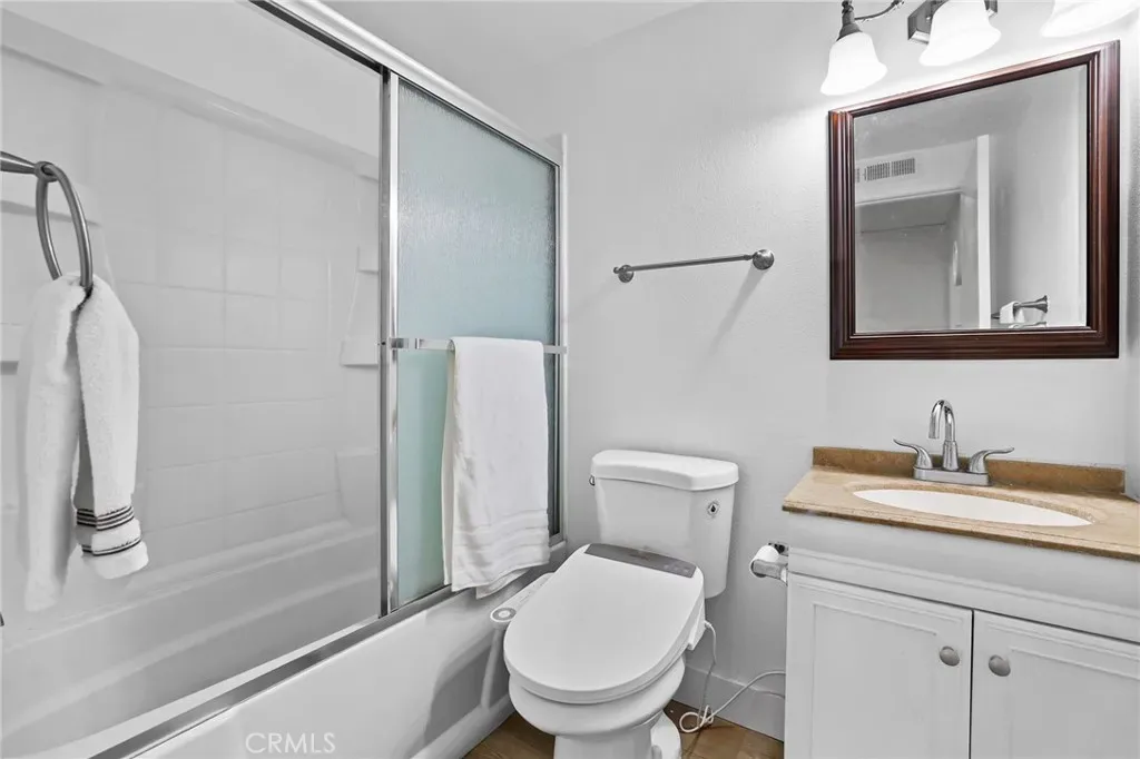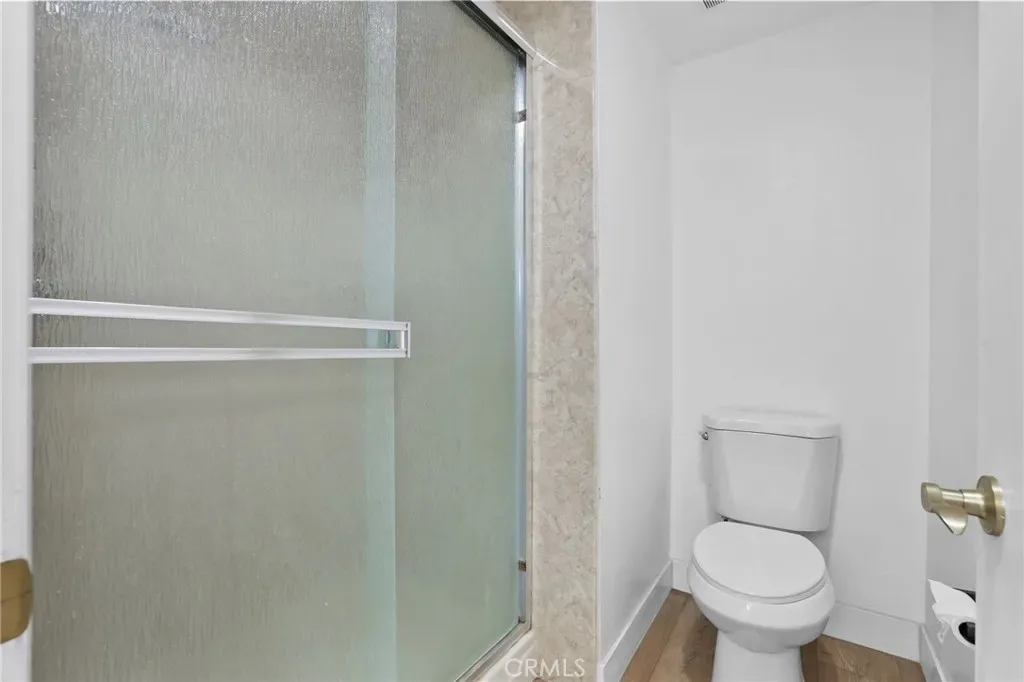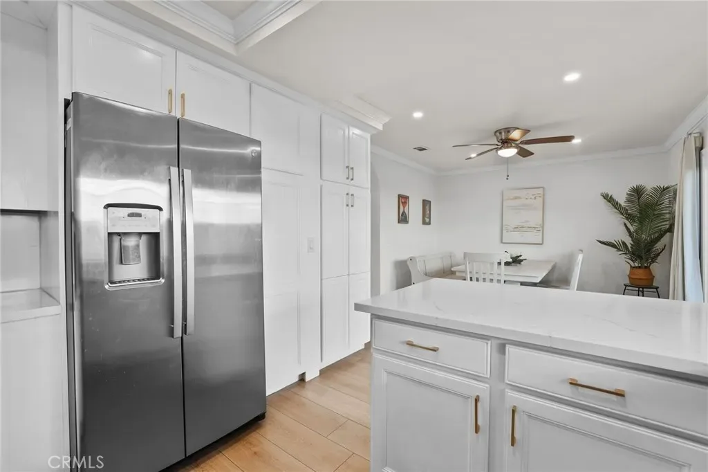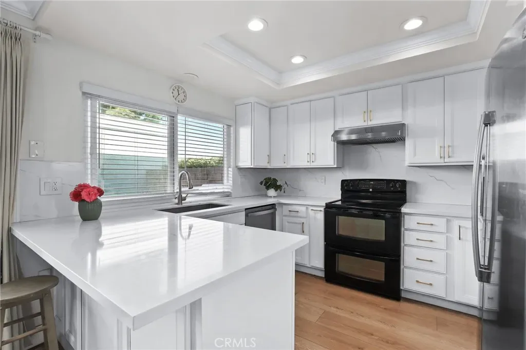 The fully remodeled kitchen showcases white cabinetry, quartz countertops, full backsplash, and stainless-steel appliances, including a refrigerator, dishwasher, a oversized sink and updated range hood. A electric range with double oven completed this kitchen. A breakfast bar connects to the bright family room, which offers flexibility as a home office, playroom, or additional living space. Large sliding doors open to a private patio, while a convenient half bathroom and storage closet are located behind a barn door.