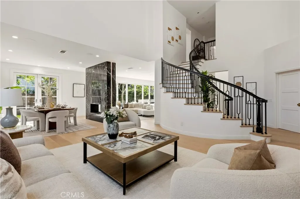 A dramatic entry welcomes you with soaring ceilings and an elegant spiral staircase, setting the tone for the thoughtfully curated designer finishes found throughout the home.