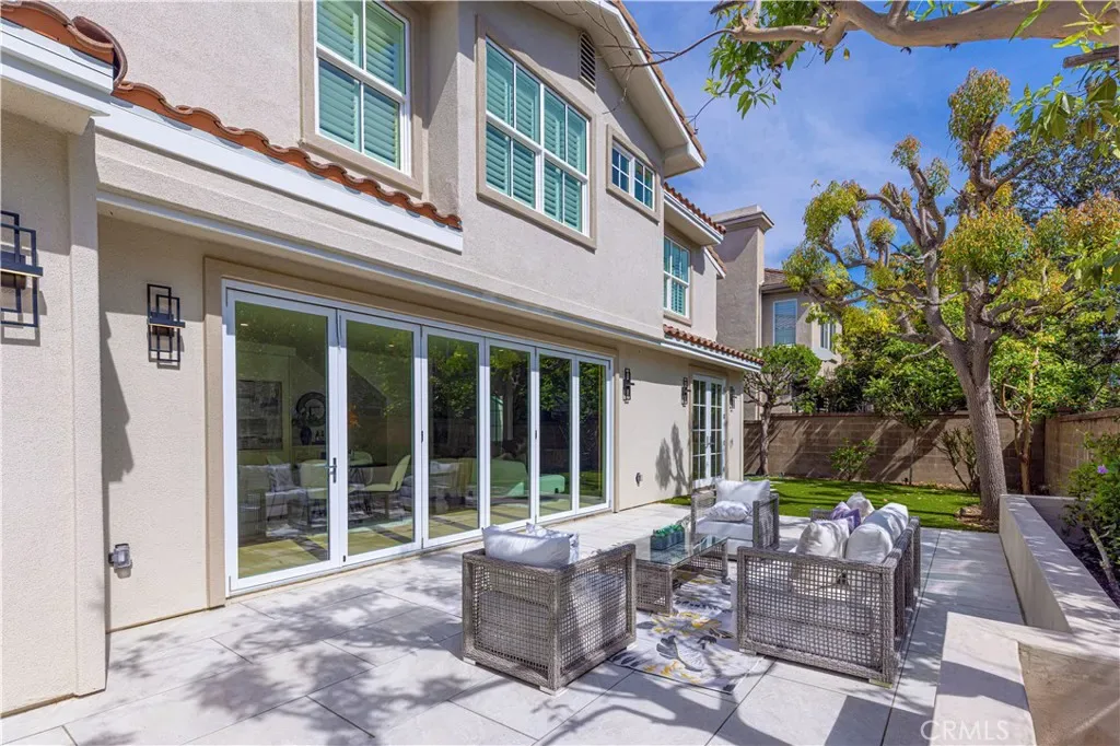 The open-concept floor plan flows effortlessly from the stylish family room—featuring a sleek ultrasonic water-vapor fireplace—and adjacent bar area to the backyard, where triple French doors open to a serene outdoor retreat for summer barbecues, morning coffee, or evening cocktails.