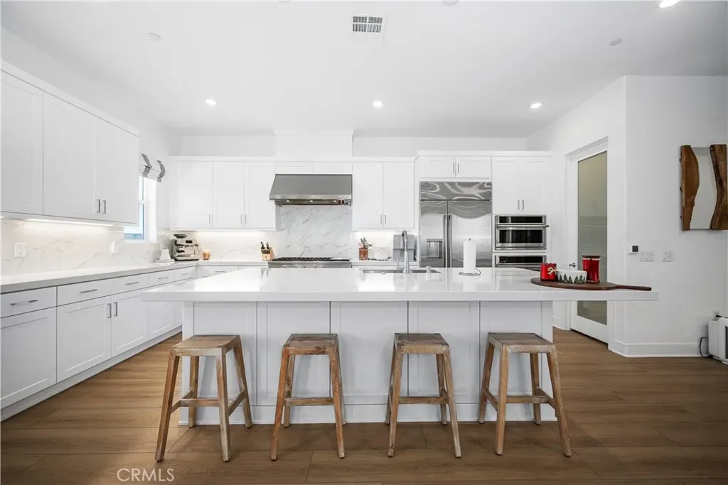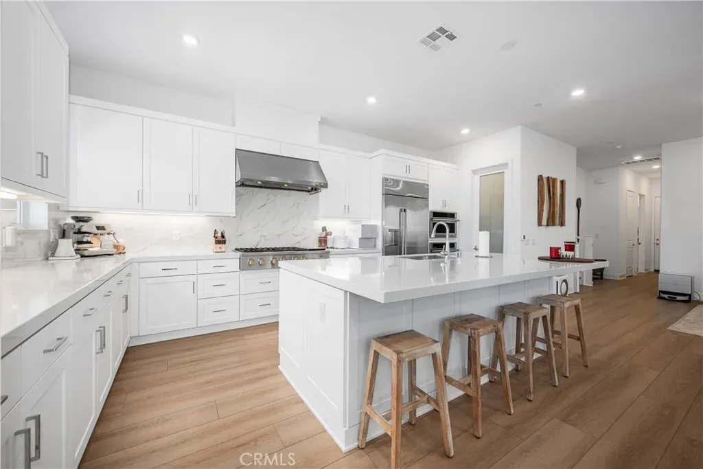 At the heart of the home lies a stunning gourmet kitchen, curated for both the culinary enthusiast and the entertainer. Featuring a massive center island, premium stainless-steel appliances including a 48-inch range and built-in refrigerator, sleek quartz countertops, and refined cabinetry, this space is as functional as it is beautiful.