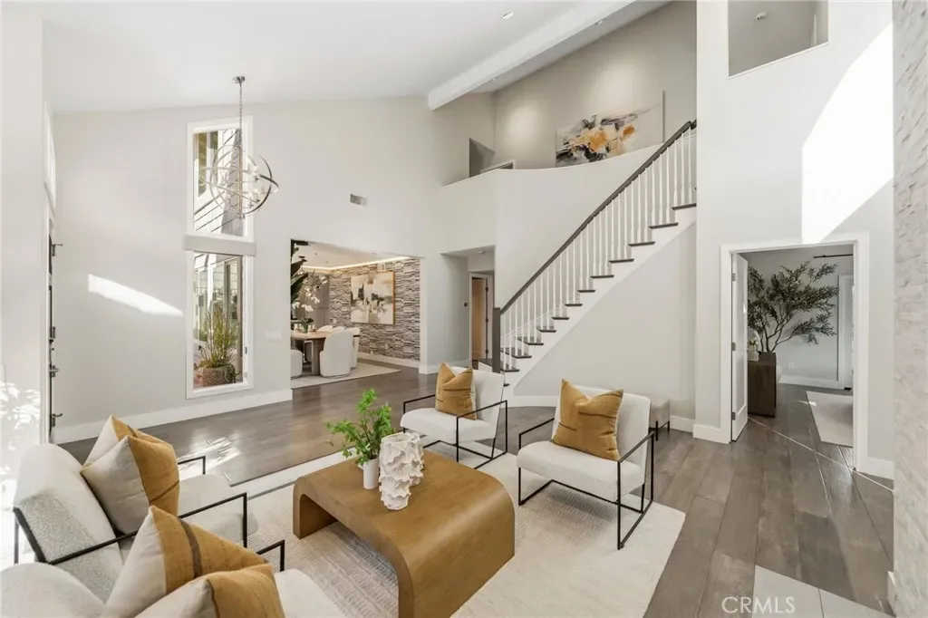 Welcome to this stunning 5-bedroom, 3-bath Orange County retreat where resort-style living meets everyday comfort in one of Irvine’s most sought-after neighborhoods. From the moment you step inside, soaring ceilings and sun-drenched living spaces exude warmth and sophisticated contemporary styling throughout this beautifully maintained 3,000 sq. ft. home. The heart of the home is a sleek, well-appointed kitchen featuring quartz counters, custom cabinetry, and a chef-inspired appliance suite — perfect for everything from casual family meals to elegant entertaining. A gracious living room anchored by a stunning ledger stacked stone fireplace flows effortlessly to the dining room, while a convenient downstairs bedroom and full bath offer ideal flexibility for guests or multigenerational living. Wide plank wood flooring, soaring ceilings, solid core doors, 5-inch baseboards, and newly installed energy-efficient windows speak to the quality of finishes found throughout. Upstairs, the spacious primary suite is a true sanctuary, complete with a spa-inspired bath featuring a soaking tub, walk-in shower, dual vanities, and a generous walk-in closet, while three additional bedrooms and a dedicated home office provide space and flexibility for every lifestyle. Step outside to your own private paradise — a breathtaking pool and spa framed by soaring palms, lush tropical landscaping, and elegant stone pillar accents with cascading water features, all flowing seamlessly to a generous covered patio where a pendant-lit dining area and built-in BBQ set the stage for unforgettable gatherings under the Southern California sky. Adding to the home’s exceptional value, a fully owned solar panel system paired with a Tesla Powerwall battery delivers energy independence and meaningful utility savings, while a whole-home water filtration system ensures clean, purified water at every tap. Ideally located within walking distance to top-rated Bonita Canyon Elementary and nationally ranked University High School, and just minutes from the 405 and 73 freeways, with very low association dues and no Mello Roos tax, this meticulously maintained home truly represents the best of Orange County living.