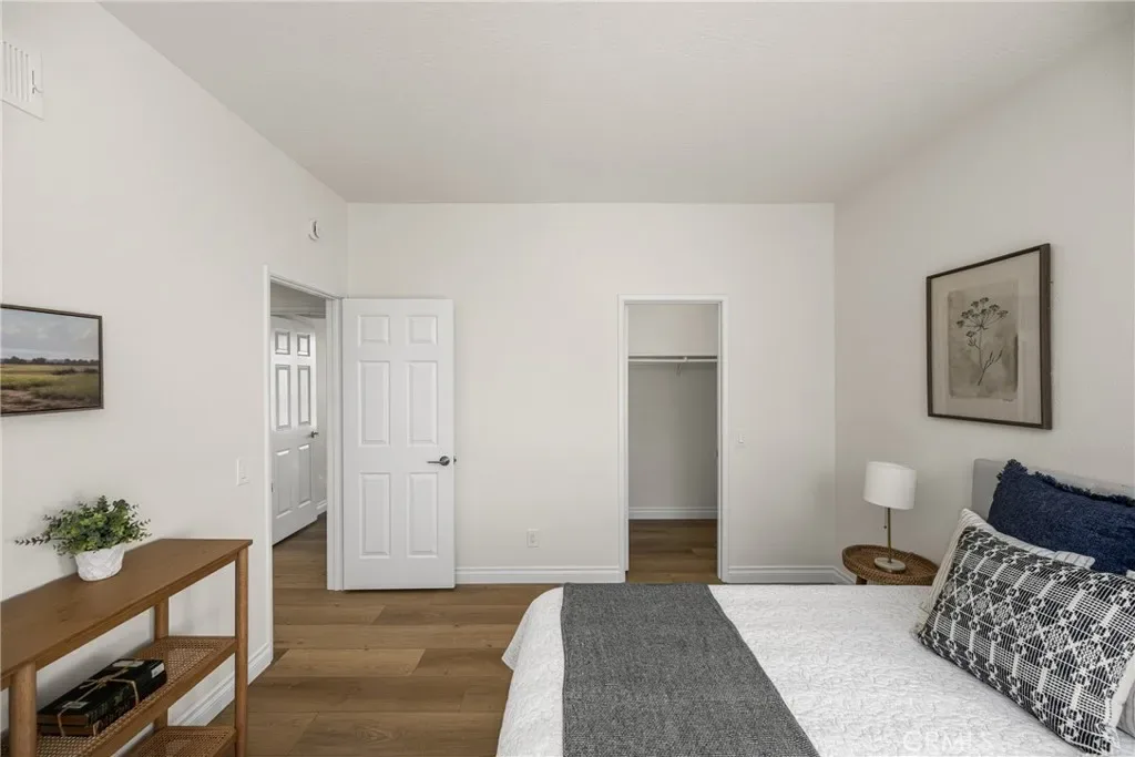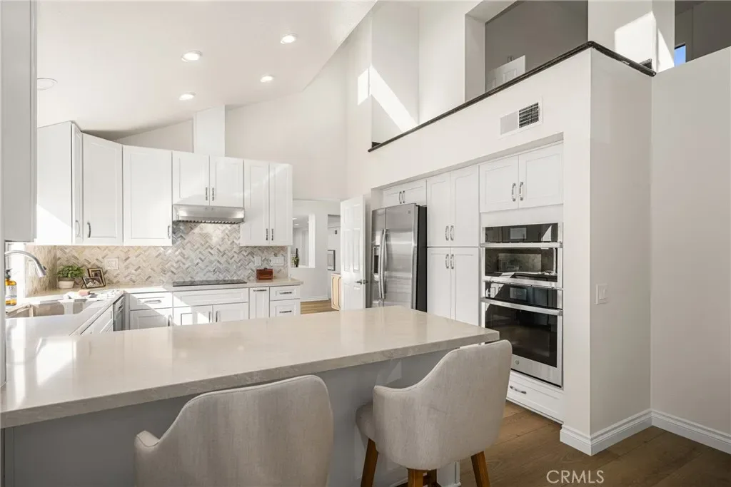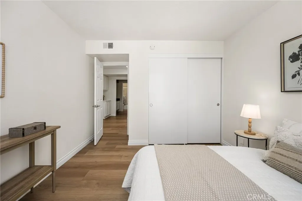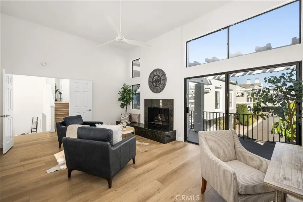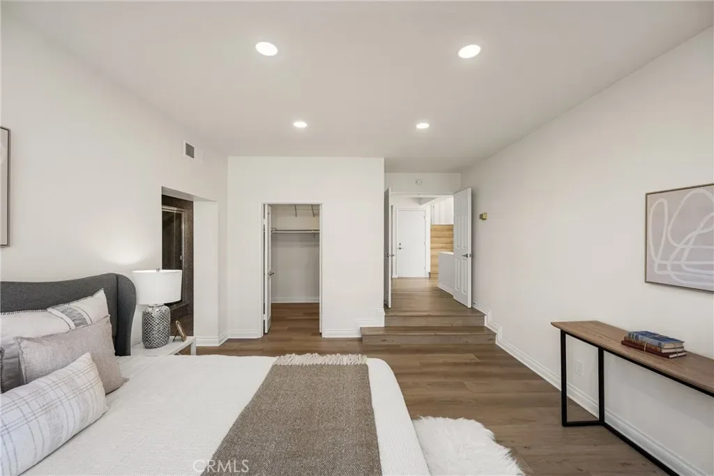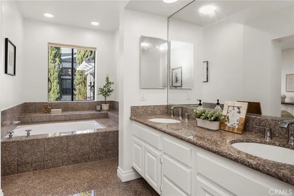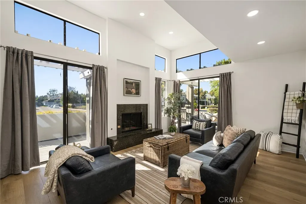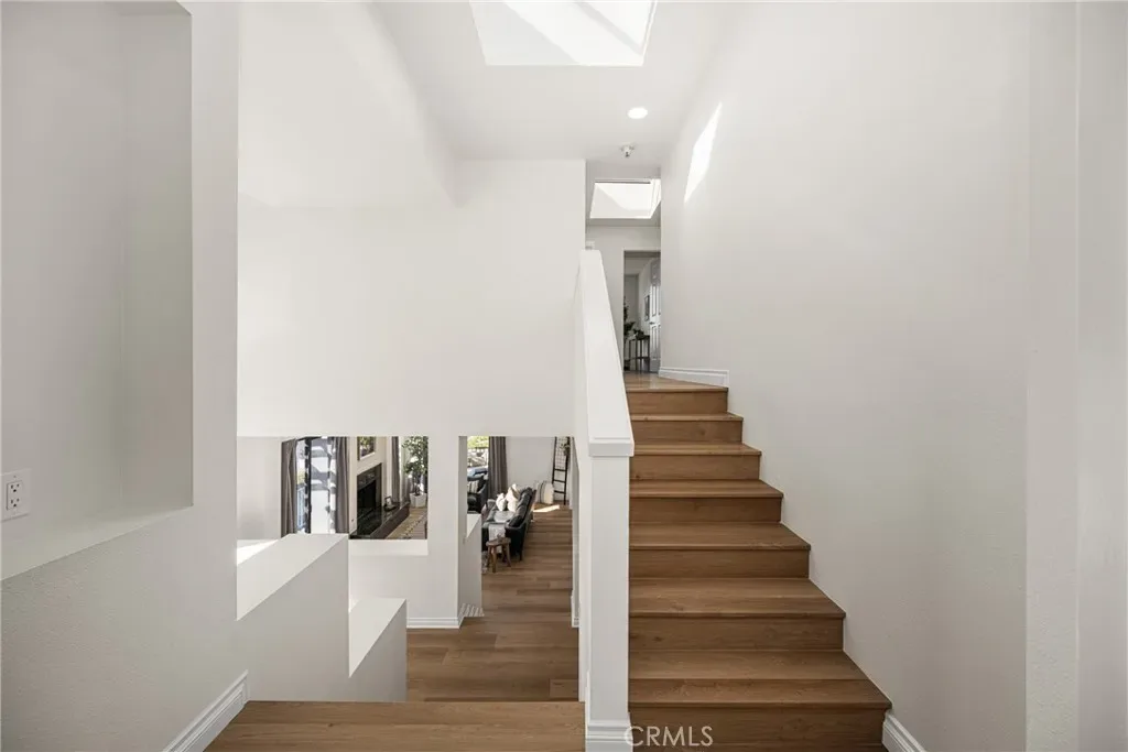 Beautifully updated home in Irvine’s highly desirable Woodbridge community, offering a spacious freshly painted multi-level layout with excellent separation of living spaces. This 4-bedroom, 3-bath residence features a highly sought-after DOWNSTAIRS PRIMARY SUITE, with three secondary bedrooms upstairs, ideal for privacy and flexible living. Luxury vinyl plank flooring with upgraded baseboards runs throughout with no carpet, creating a clean, cohesive look. The living room and family room each feature a fireplace, while soaring ceilings and expansive windows bring in abundant natural light. The multi-level design adds architectural interest and openness, while still providing defined spaces for everyday living and entertaining. A new HVAC unit has just been installed. The kitchen features a breakfast counter-bar, white shaker cabinetry, quartz countertops, a contrasting full backsplash, and brand new stainless steel appliances. It opens to the dining room and living area and offers ample cabinetry, counter space, and storage. An upper-level family room provides flexible use as a home office, media space, or additional lounge area. Upstairs also includes three well-proportioned bedrooms, a bathroom with dual vanities and granite countertops, and a convenient laundry closet. The downstairs primary suite offers a private setting with generous space, large windows, and an en-suite bathroom featuring dual vanities, and a soaking tub. Outdoor space includes a private deck with lagoon views and a patio cover, providing a comfortable area to relax or entertain. Additional features include a direct-access 2-car garage and good storage throughout. Woodbridge residents enjoy access to two lakes, beach lagoons, pools, parks, tennis and pickleball courts, volleyball courts, and scenic walking trails. The home is conveniently located near Meadow Park Elementary, South Lake Middle School, and Woodbridge High School, all within the Irvine Unified School District. Nearby shopping and dining options include Woodbridge Village Center and Alton Square, offering restaurants, a movie theater, and everyday conveniences. Low tax rate and NO MELLO-ROOS.