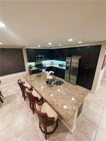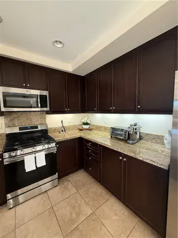 The open living and dining areas are finished with sleek tile flooring, creating a contemporary and inviting space. The designer kitchen is equipped with dark, rich cabinetry, Cortes countertops, a center island with breakfast bar, and brand-new stainless steel appliances, including a refrigerator, stove, microwave, dishwasher, and sink. A separate laundry room includes a washer and dryer for added convenience. All furniture is new, never used!