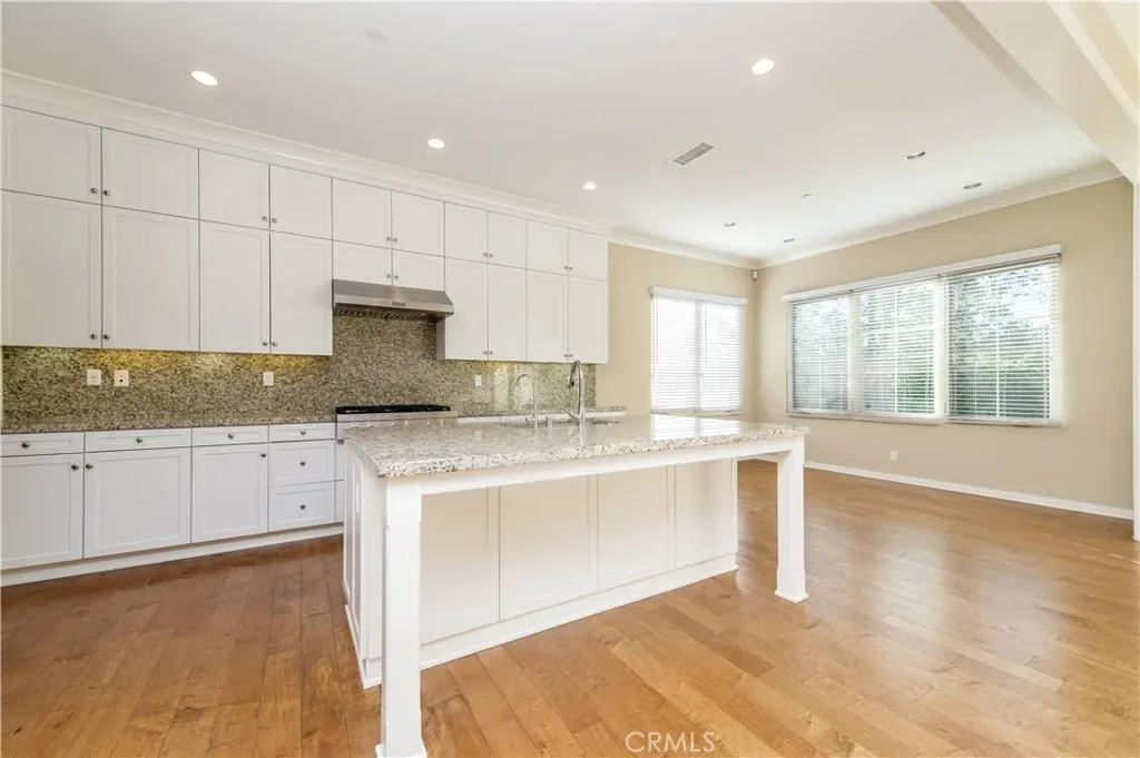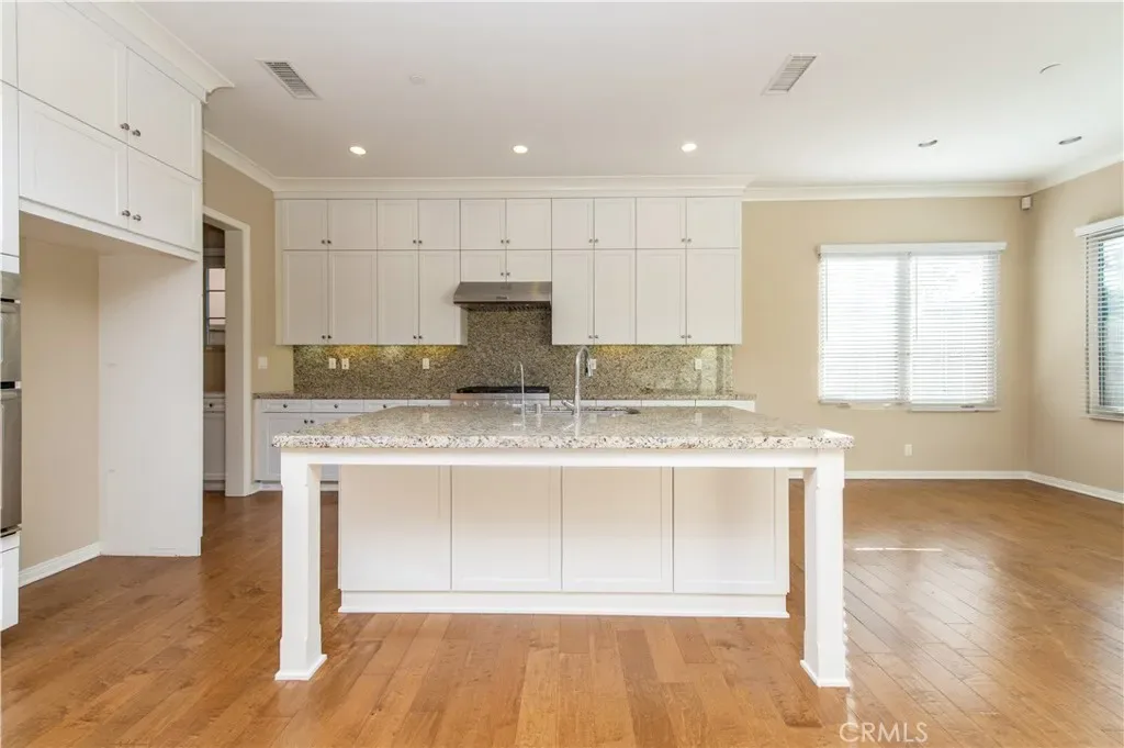 –Open gourmet kitchen featuring a large granite island, brand-new 6-burner stovetop, abundant cabinetry, and dedicated space for refrigerator and dishwasher (include).