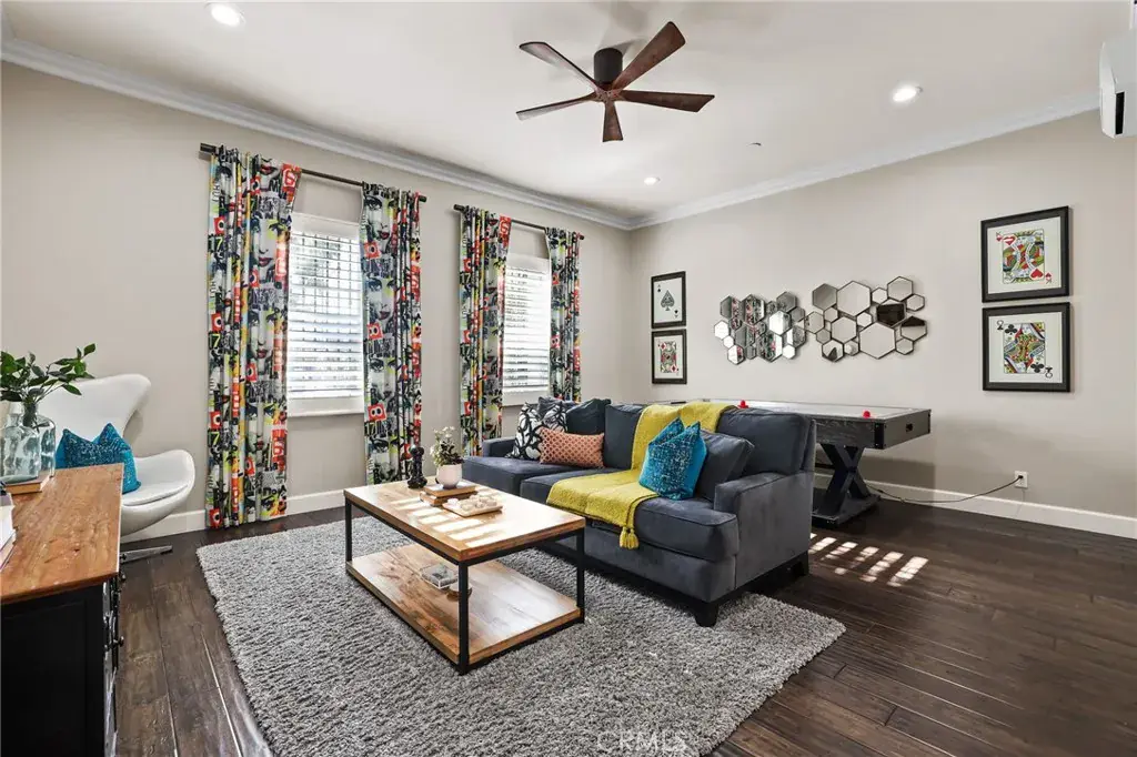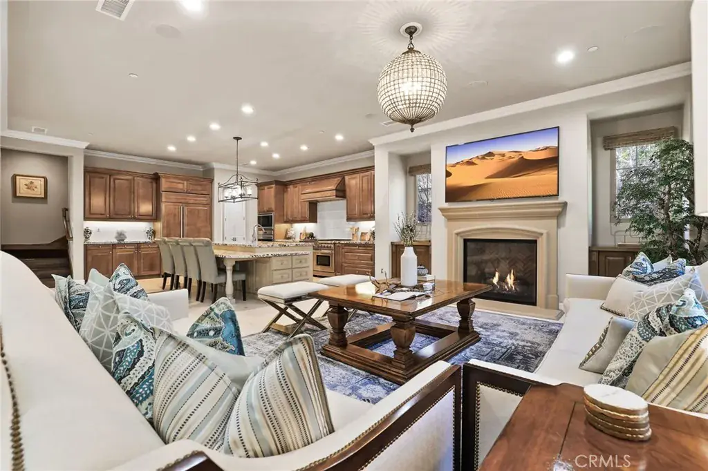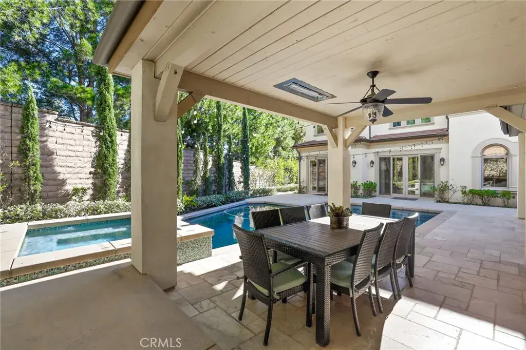 Tucked away on a quiet cul-de-sac, this exceptional Mediterranean-inspired residence blends timeless architecture with refined interiors and true resort-style indoor-outdoor living. A manicured front yard and elegant covered entry lead into a private courtyard, setting an immediate tone of sophistication and privacy. Inside, soaring ceilings, custom columns, crown molding, and abundant recessed lighting enhance the open and airy floor plan. Formal living and dining areas flow effortlessly, offering ideal spaces for both everyday living and elegant entertaining. Durable tile flooring spans the main level, adding warmth, durability, and an elevated sense of luxury. The gourmet kitchen serves as the heart of the home, featuring rich cabinetry, granite countertops, a generous center island with seating, high-end built-in appliances, and designer lighting. It opens seamlessly to a spacious family room with a cozy fireplace, custom built-ins, and expansive windows that fill the space with natural light. The main level offers outstanding flexibility with a private bedroom and en-suite bathroom, ideal for guests or multi-generational living along with a dedicated entertainment or media room and a stylish powder room for added convenience. Upstairs, a spacious loft with built-in cabinetry provides versatile space for a secondary family room, study area, or home office. The luxurious primary suite features a sitting area and spa-inspired bathroom with dual vanities, a soaking tub, and a large walk-in shower. Three additional bedrooms each include private en-suite bathrooms, offering comfort and privacy. Sliding doors create seamless indoor-outdoor flow to beautifully designed exterior spaces. The side yard offers a peaceful retreat with stone hardscape, café lighting, a water feature, and fire pit. The expansive backyard is an entertainer’s dream. A covered California room anchors the space and includes a built-in outdoor kitchen, bar seating, dining area, heaters, ceiling fans, and a cozy fireplace, designed for year-round enjoyment. Beyond, a stunning resort-style salt water pool and spa are surrounded by lush landscaping and dramatic lighting, creating a serene and private oasis. Other features include solar panels owned and paid off and the whole house water softening system. Community amenities include pools, a clubhouse, playgrounds, and sports courts, all within walking distance to shopping and award-winning schools. A truly exceptional place to call home.