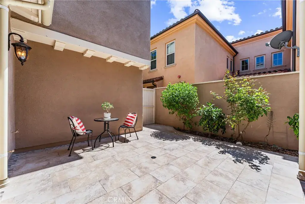 A fabulous townhome that feels like a detached single family home–only one attached wall and mostly in the garage! Located on a quiet interior street, this popular Monterey Plan 3 in Woodbury East displays architectural sophistication, highlighted by abundant windows and doors, an inviting front porch, & a charming courtyard. Adding to its curb appeal is a rarely seen upper deck that enhances the handsome front façade and distinctive architectural character. 3 bedrooms plus a den/office with high-end custom upgrades at every turn. As you enter, timeless staggered travertine flooring flows throughout the entire first floor. Brand-new carpet on the staircase and second floor. An expansive living room opens to a gourmet kitchen with a large central island. Situated at the heart of the home, the kitchen boasts granite countertops, a full backsplash with glass/natural stone mosaics, custom cabinetry with glass-paneled doors, under cabinet lights, and stainless steel appliances. New interior paint, including baseboards and walk-in pantry’s shelves. The spacious dining area features a sliding glass door, opening to an enchanting courtyard, beautifully landscaped with staggered tiles, mosaic accents, & fruit trees—perfect for indoor-outdoor living. The primary suite showcases a private deck and a luxurious ensuite bath, upgraded with marble countertops, a marble tub surround, and a walk-in shower. Mirrored closet doors & high-end built-in closet organizers in all 3 bedrooms. Whole house water softener/filtration system. Reverse osmosis under the kitchen sink. Instant hot water circulator under the primary bath’s sink. LED recessed lighting with dimmers in every room, plantation shutters, crown moldings, 2 NEST thermostats, & keyless entry for both the front and garage doors. The garage is fully finished with epoxy flooring, 50 amp-250V plug for EV, and custom cabinetry throughout—including built-in shoe shelves. Unwind on the covered deck after a long day, dine under the stars in the courtyard, or showcase your favorite flower pots on the welcoming front porch. World-class HOA amenities, including pools, spas, sport courts, a gym, clubhouse, tot lots, and more. The Monterey HOA not only maintains the landscaping, exterior paint, roof, balcony, and termite work, but also offers another pool/shaded kiddie pool and a playground within walking distance. Easy access to freeways and just minutes from Woodbury Town Center, the Great Park, Irvine Spectrum, and more.