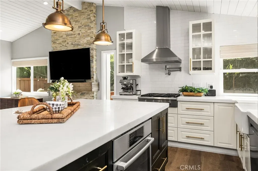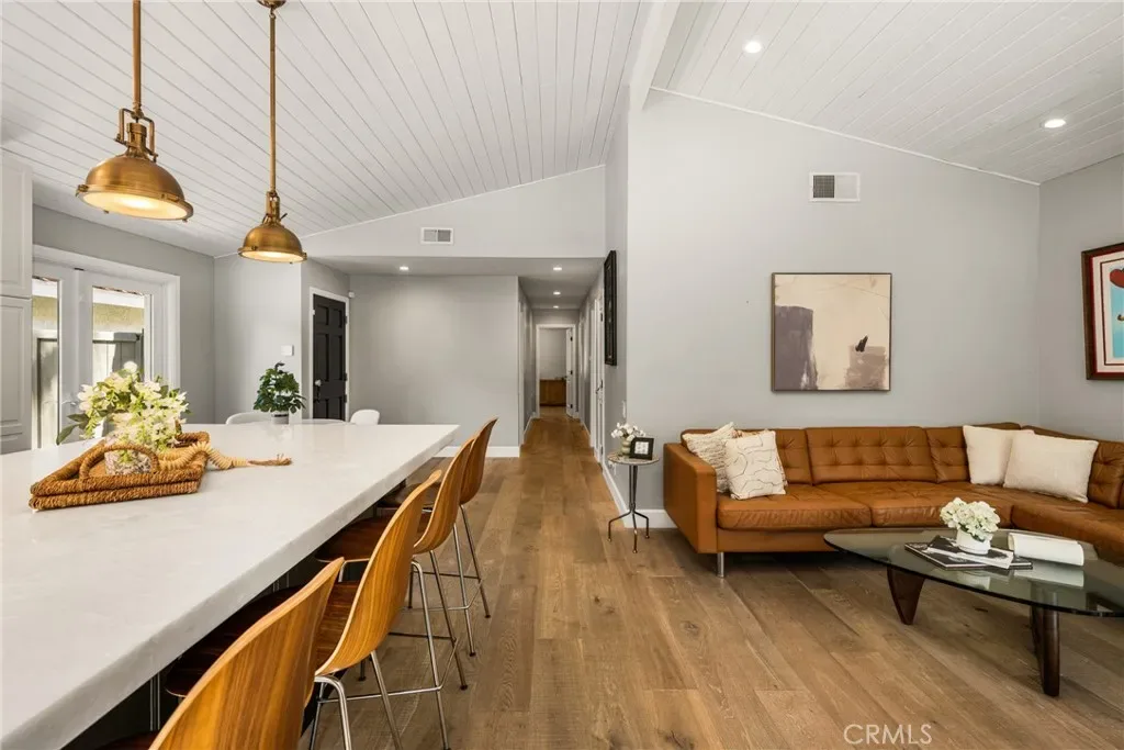 Welcome to 10 Petersburg, a highly upgraded SINGLE-STORY home in Irvine’s Northwood neighborhood offering 3 bedrooms, 2 bathrooms, and approximately 1,370 square feet of well-designed living space. A charming Dutch entry door creates a warm first impression, and the direct-access 2-car garage with driveway adds everyday convenience. Ideally located near Northwood Park and the community pool, this home combines comfort, function, and location. Inside, the home feels open and easy, with vaulted ceilings, engineered hardwood flooring, recessed lighting, and a layout that flows naturally from room to room. The remodeled kitchen is a true focal point, featuring a large quartz island with seating, white cabinetry, brass hardware, stainless steel appliances, a farmhouse sink, and pendant lighting. There’s plenty of counter space, along with a statement vent hood and glass-front upper cabinets that give the space a clean, updated look without feeling overdone. The kitchen opens directly to the dining and living areas, making it ideal for both everyday living and entertaining and the living room is anchored by a stone fireplace with a wood mantel and mounted TV. Large windows and French doors bring in natural light and connect the interior to the backyard. Outside, the backyard offers a great mix of lawn, patio areas, and mature landscaping. String lighting adds a nice touch in the evenings, and there’s space to relax, entertain, or just enjoy some privacy. The side yard areas add flexibility and make the lot feel more usable overall. The primary suite is set toward the back of the home and feels bright and private, with vaulted ceilings, a stunning organized walk-in closet and direct access to the yard. The ensuite bath includes dual sinks, marble-look counters, a walk-in shower, and a soaking tub. Secondary bedrooms are well-sized and flexible, whether for guests, family, or a home office. The hall bath with a walk-in shower has also been updated with clean finishes and a modern vanity. Highly upgraded throughout, with a functional single-level layout and a location in one of Irvine’s most established neighborhoods, this is a home that’s easy to move into and enjoy right away.