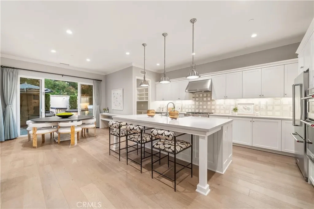 Step outside to a private backyard retreat designed for relaxation and entertaining. Beautiful stone hardscape leads to a California room, tranquil waterfall feature, and fire pit. The outdoor kitchen is equipped with a Lynx BBQ, sink, and refrigerator. A heated pool and spa complete the backyard, surrounded by mature landscaping for enhanced privacy.