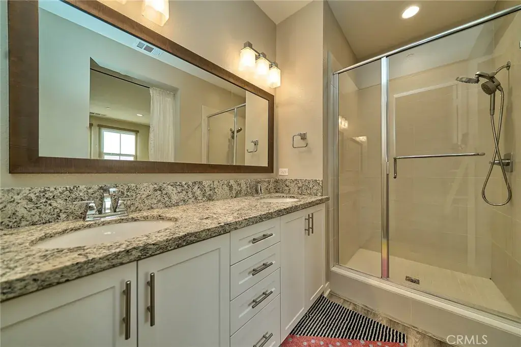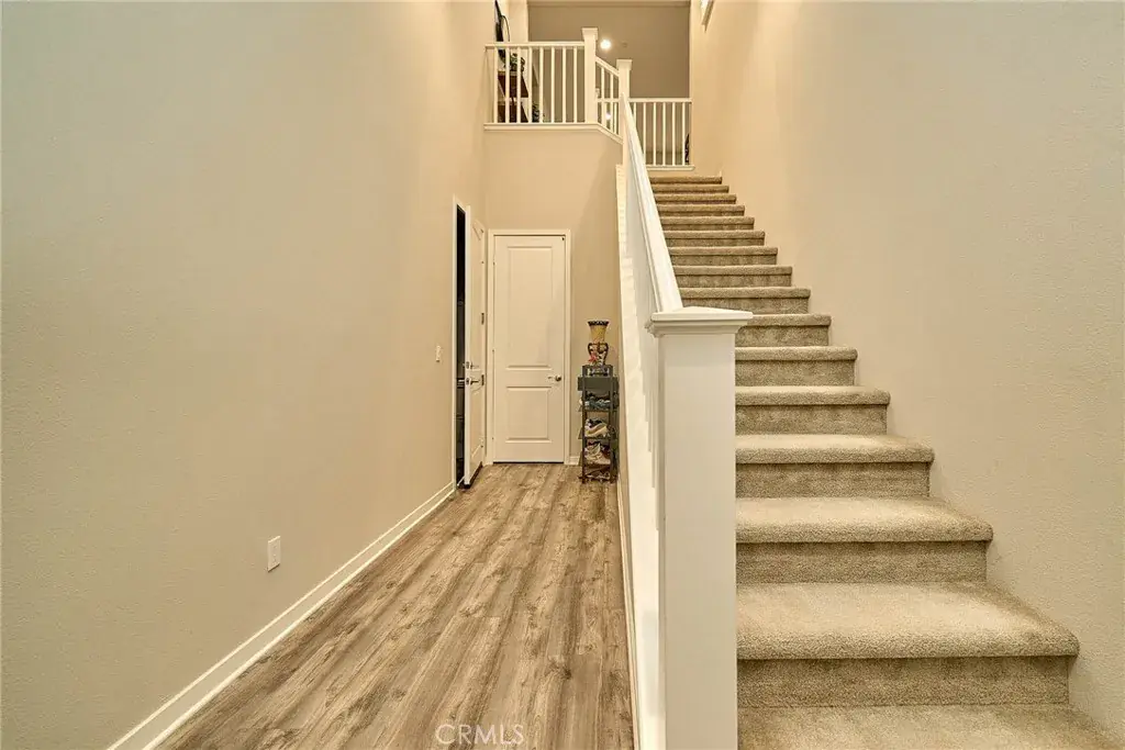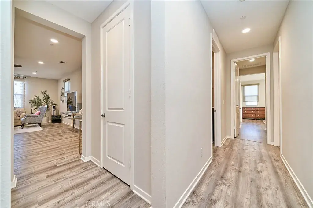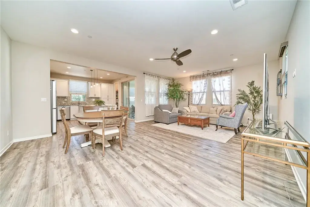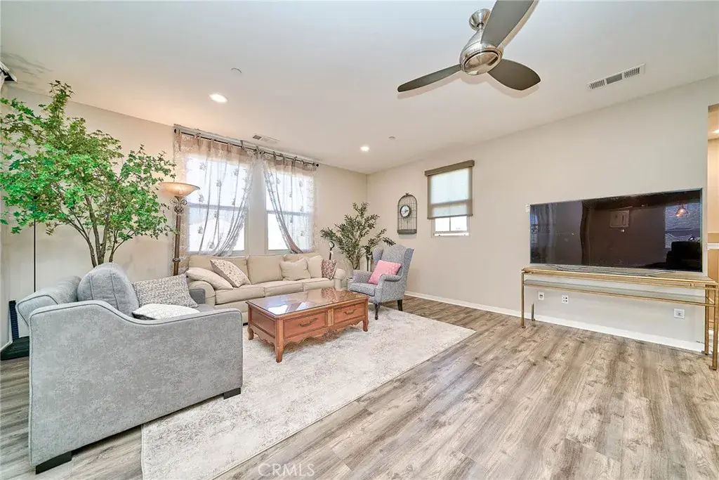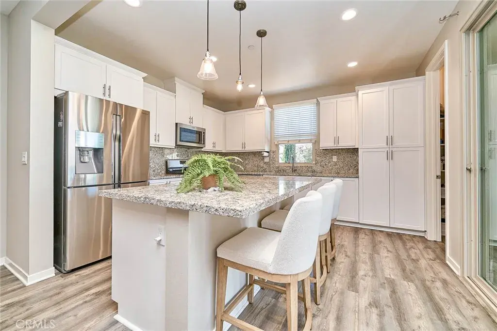 With two spacious primary bedrooms, a large private balcony, and a generous 2.5 car garage, this upgraded end unit in Portola Springs comfort and a well-designed layout. The second floor features an open concept living area with wide plank vinyl flooring, high ceilings, and a seamless flow between the kitchen, dining, living room, and outdoor space. A large kitchen island anchors the heart of the home, surrounded by granite countertops, an upgraded granite backsplash, soft-close cabinetry, and a spacious walk-in pantry for easy, everyday storage. The main primary suite includes dual walk-in closets with built-in shelving, a walk-in shower with modern large-format tile, dual sinks, and granite countertops. The secondary suite features its own full bathroom and plenty of space to unwind or accommodate guests. The laundry room is conveniently located upstairs and includes a washer and dryer. On the ground level, the entry features double-height ceilings and a large storage closet under the staircase. There is direct access to an oversized 2.5 car garage offering space for two vehicles along with extra room for bikes, a workshop, or additional storage. With no one above and only one shared wall, this home provides a sense of privacy in a prime location within Portola Springs. Just steps from resort-style amenities, residents enjoy access to 12 private pools, 20 parks, multiple clubhouses, and scenic trails that connect to Portola Springs Nature Preserve, the Portola Staging Area, and Loma Ridge.