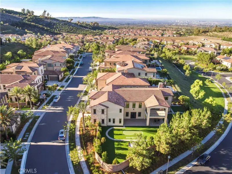 Situated within the prestigious guard-gated enclave of The Grove at Orchard Hills, this Cielo residence by Toll Brothers offers the perfect blend of timeless sophistication and contemporary California living. Ideally positioned on a desirable corner lot along one of the community’s most tranquil and sought-after streets, this stunning home captures both privacy and elegance. A charming semi-enclosed front porch welcomes you before entering through the grand double doors into a sun-filled, open-concept interior. Designed for seamless indoor-outdoor living, the residence showcases five spacious ensuite bedrooms—including a convenient main-level suite—alongside five and one-half bathrooms and an expansive upstairs bonus lounge, creating an ideal layout for multi-generational living. The impressive foyer, framed by a sweeping staircase and versatile flex room, opens to beautifully connected formal and casual spaces. The gourmet chef’s kitchen is appointed with Wolf and Sub-Zero appliances, an oversized island, flowing effortlessly into the dining area, family room with fireplace, and great room that transitions seamlessly to the outdoor entertaining space. The home’s unique corner location and desirable floor plan highlight an expansive courtyard and backyard, set on an impressive 11,420 square foot lot. Designed for both leisure and play, the outdoor retreat features a bike and scooter path, sandpit, garden bed, and a large artificial turf area, offering a dream environment for children while adults enjoy breathtaking sunset views over the avocado groves. A spacious three-car tandem garage provides ample room for large vehicles, SUVs, or even RVs, complementing the home’s thoughtful functionality and style. Experiencing the very best of Orchard Hills living—where refined luxury, family comfort, and resort-inspired amenities come together in wonderful harmony.