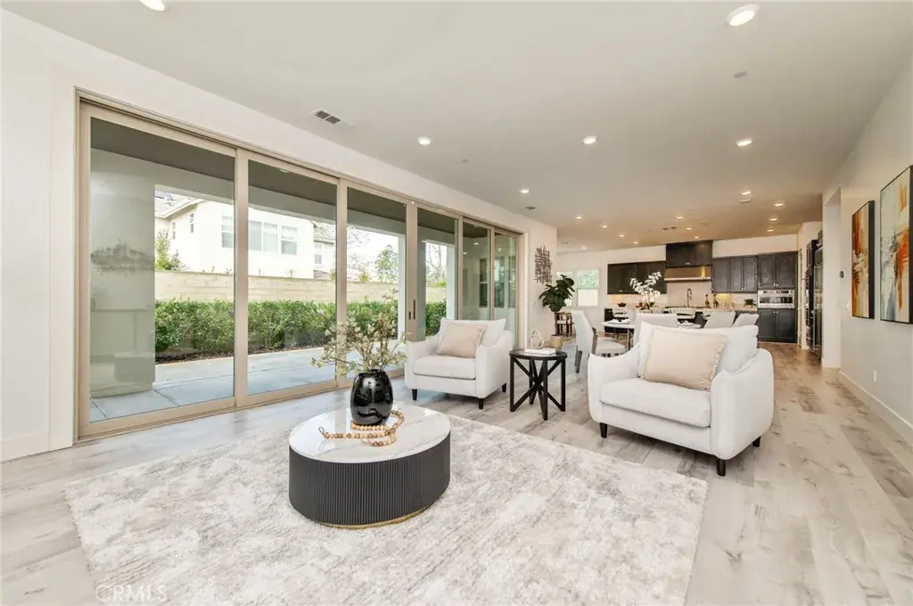 Experience true indoor-outdoor living as six-panel multi-slide glass doors disappear to reveal a tranquil California Room. The low-maintenance backyard, featuring premium synthetic turf, serves as a private sanctuary for relaxation or sophisticated entertaining.
