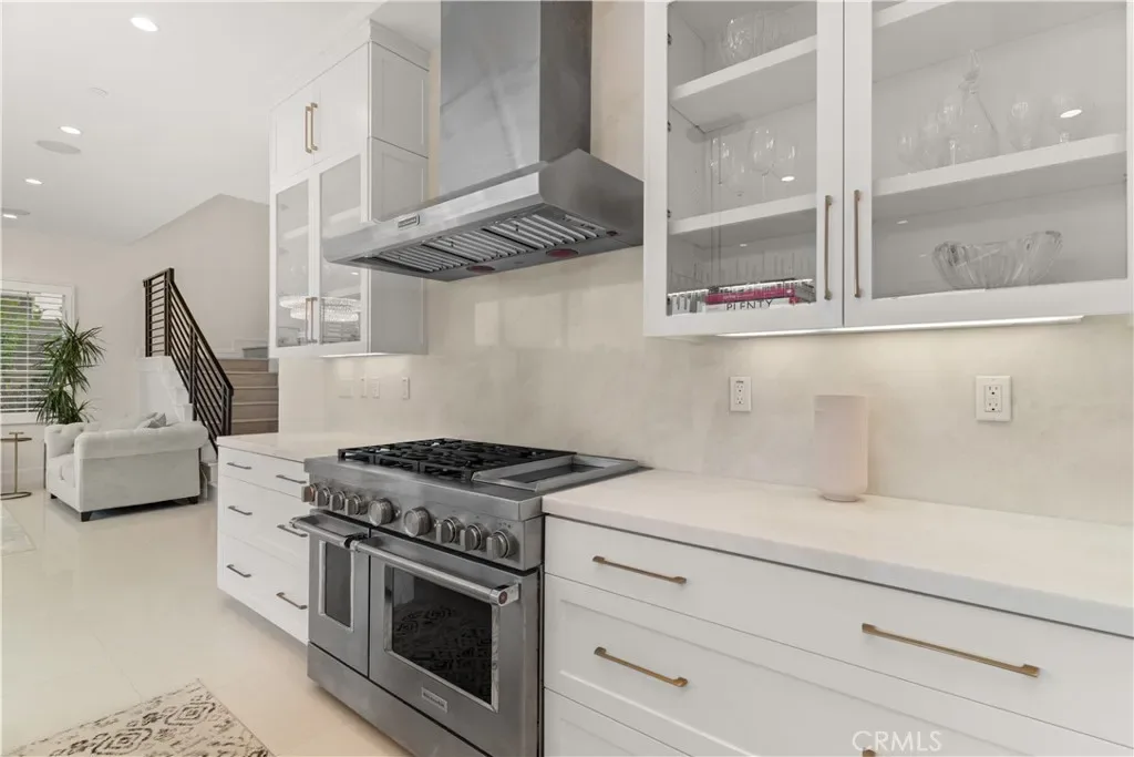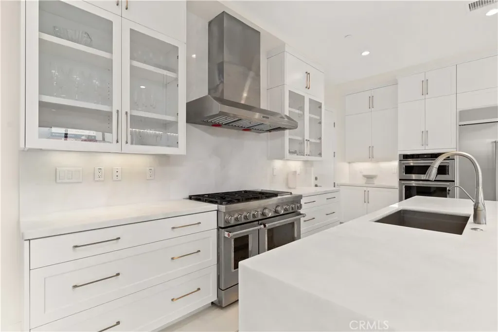 The gourmet chef’s kitchen is elegantly appointed with a large center island and wraparound bar seating, upgraded KitchenAid stainless steel appliances, a built-in refrigerator, and a secondary private pantry.