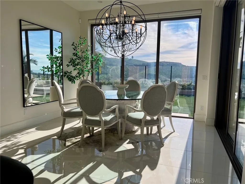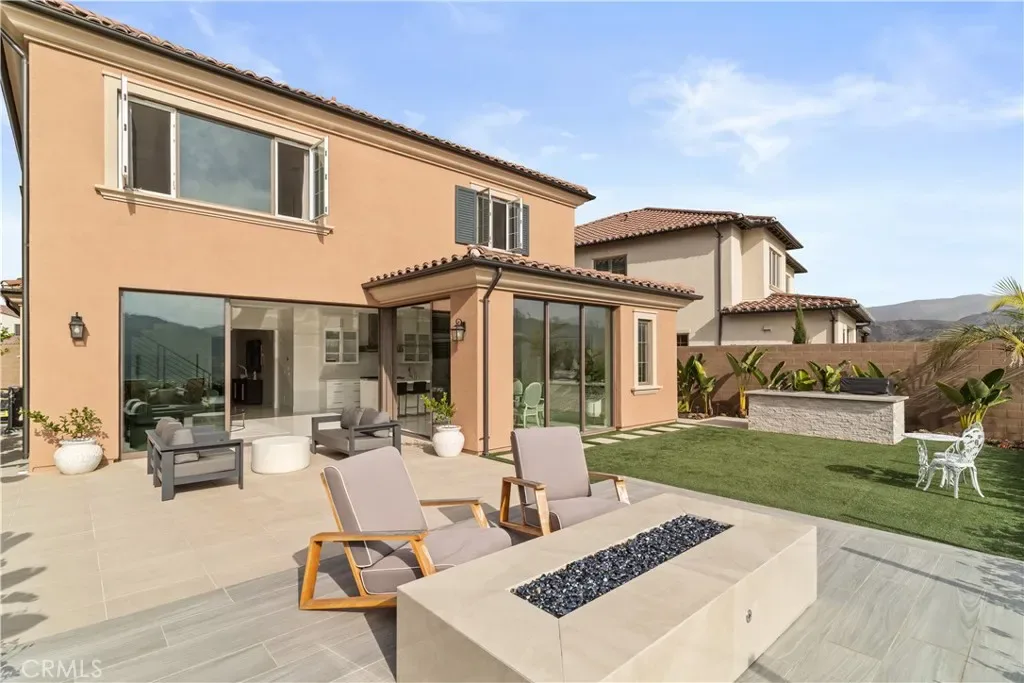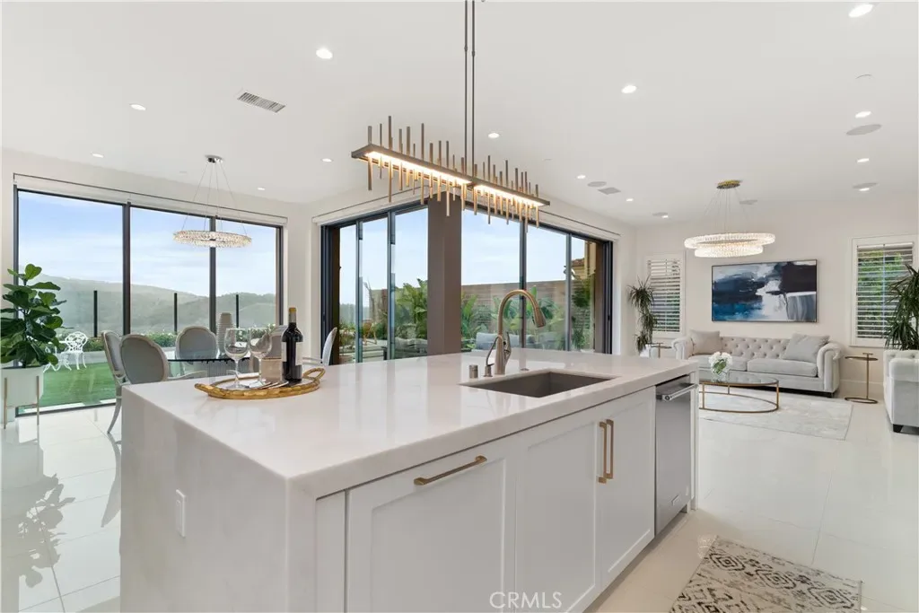 The expansive great room flows effortlessly into the dining area and opens through dramatic panoramic sliding glass doors to a dream backyard. Enjoy outdoor living at its finest with a custom fire pit, sitting area and built-in BBQ, all set against breathtaking views of water and rolling hills—perfect for relaxing or hosting unforgettable gatherings.