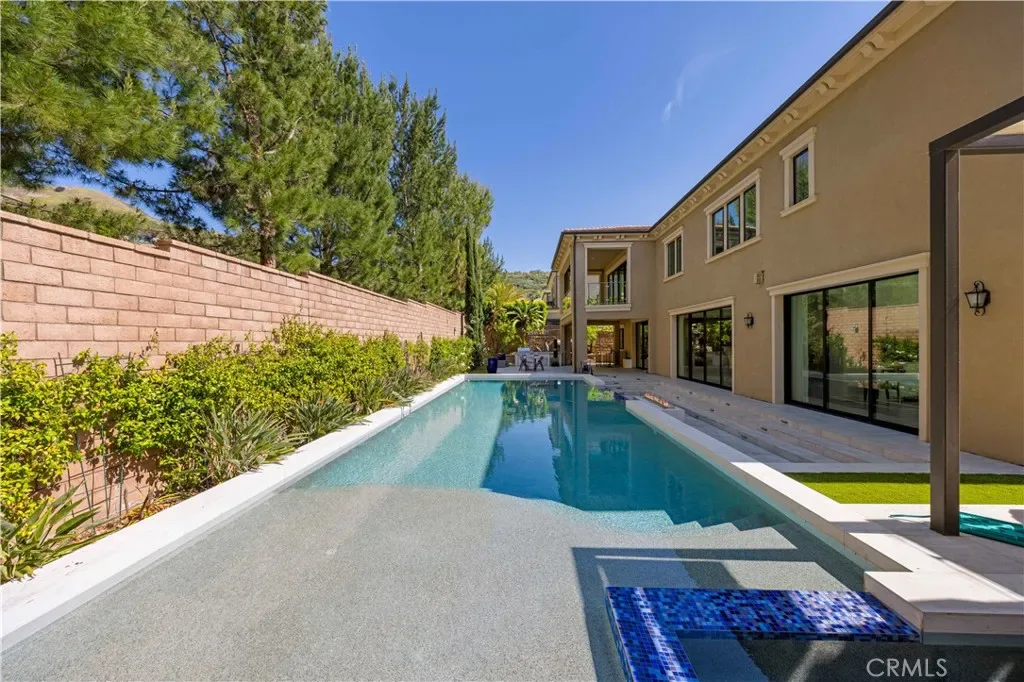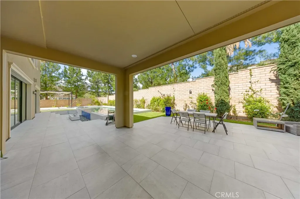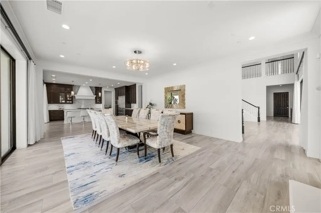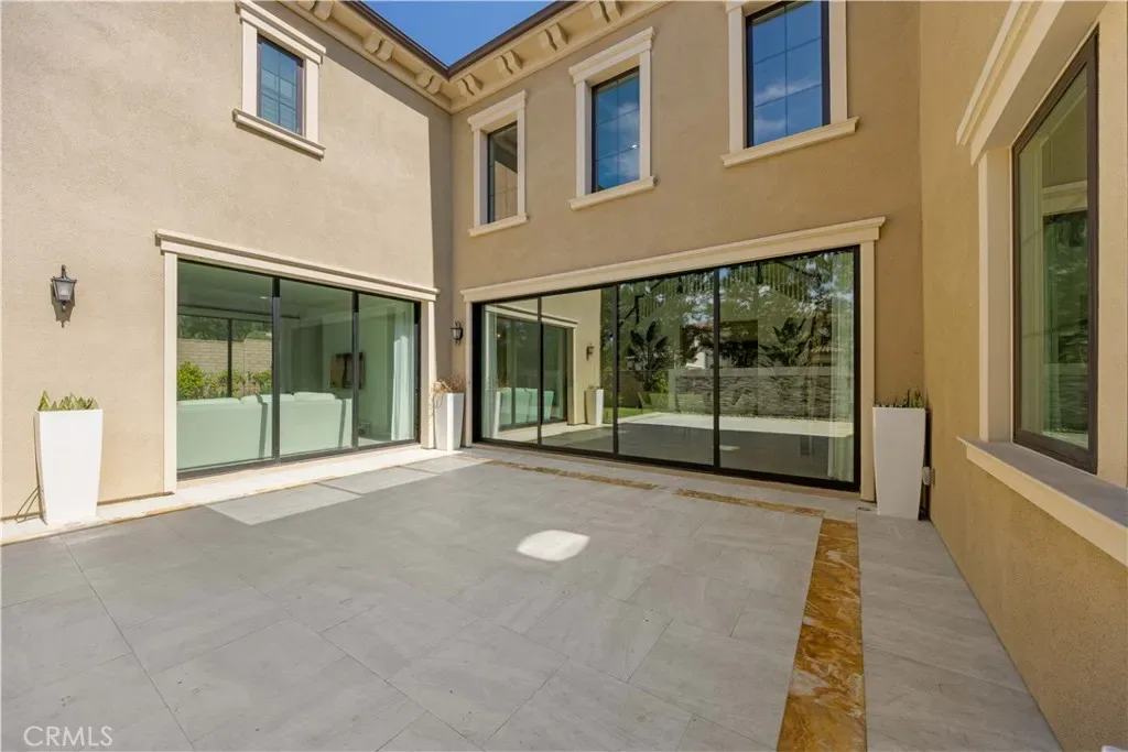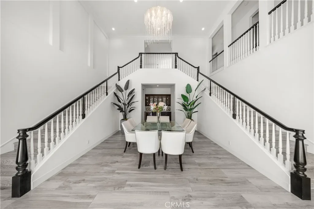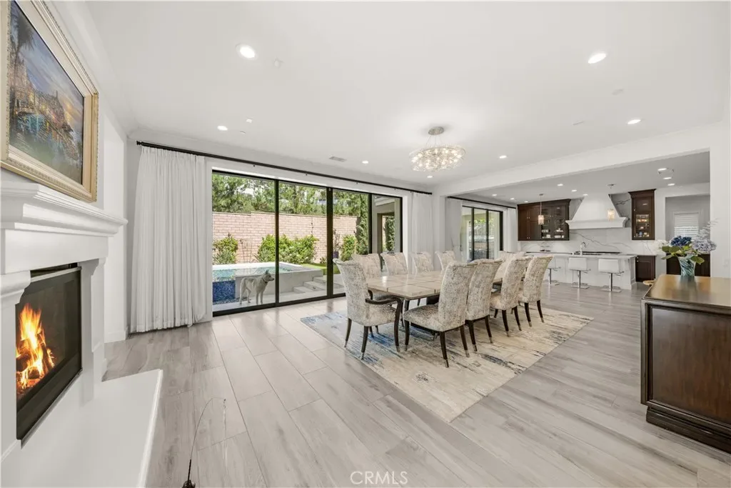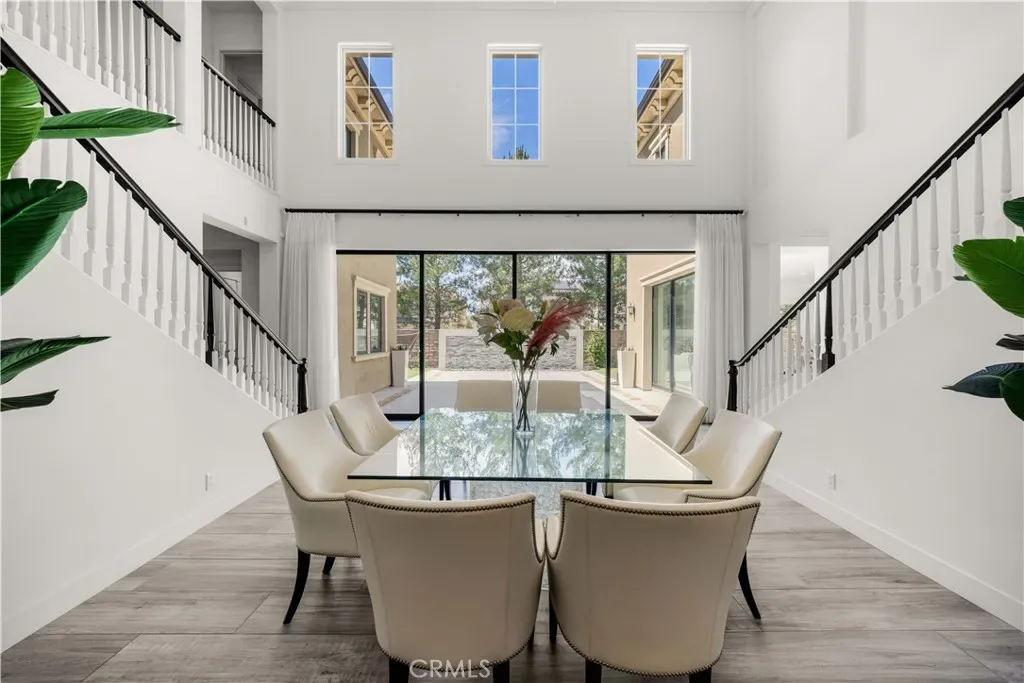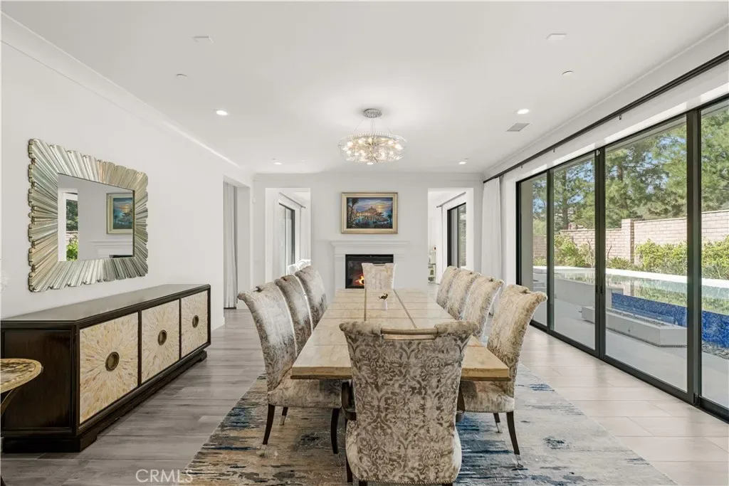 A gracious covered porch sets the tone as you enter an expansive, light-filled floor plan where oversized windows bathe every room in natural light. The grand dining room is an entertainer’s dream, framed by soaring 20-foot double-volume ceilings and an elegant dual staircase, with serene views into the private interior courtyard. Ideal for hosting dinner parties. In the living and family rooms, full-wall corner glass pocket doors dissolve the boundary between indoors and out, opening seamlessly to the beautifully appointed backyard, complete with an outdoor kitchen, BBQ, sparkling pool, fireplace, water fountain, and lounge area, perfect for year-round entertaining.