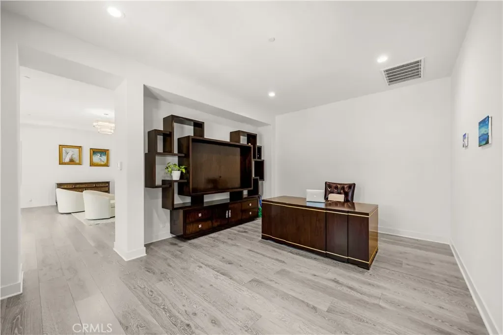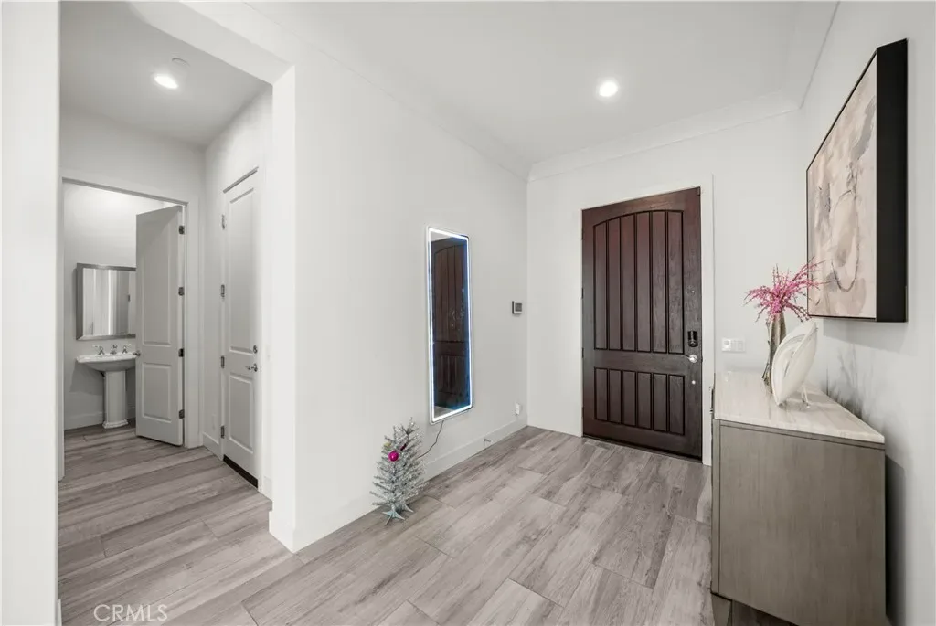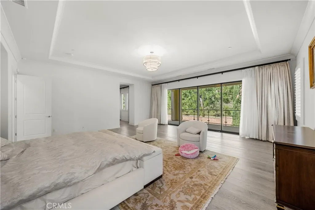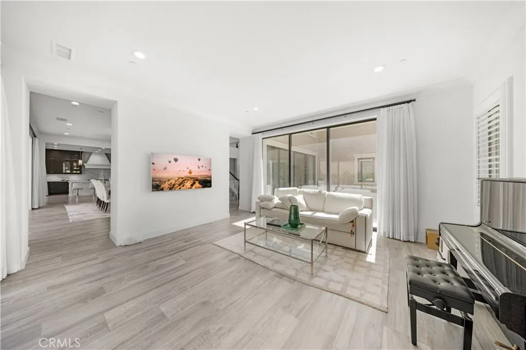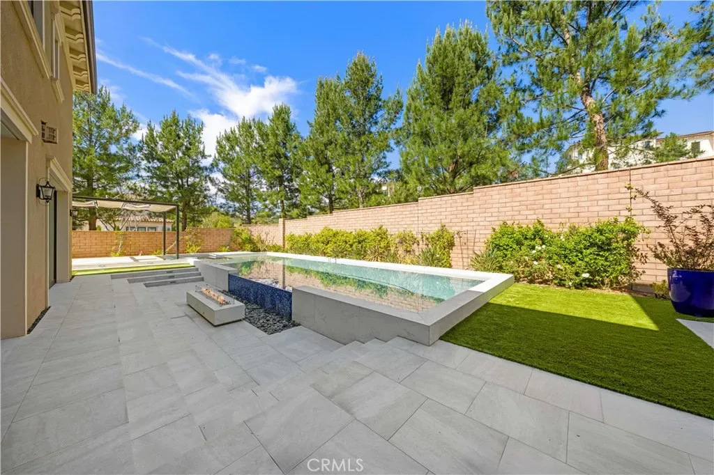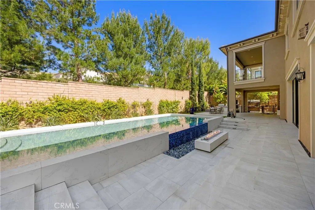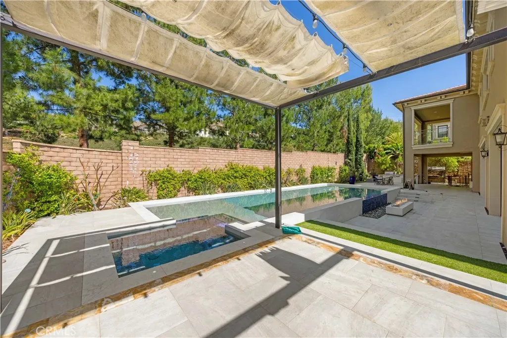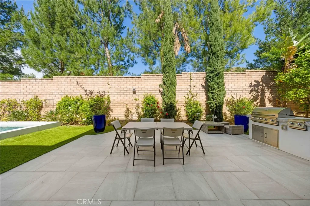 A gracious covered porch sets the tone as you enter an expansive, light-filled floor plan where oversized windows bathe every room in natural light. The grand dining room is an entertainer’s dream, framed by soaring 20-foot double-volume ceilings and an elegant dual staircase, with serene views into the private interior courtyard. Ideal for hosting dinner parties. In the living and family rooms, full-wall corner glass pocket doors dissolve the boundary between indoors and out, opening seamlessly to the beautifully appointed backyard, complete with an outdoor kitchen, BBQ, sparkling pool, fireplace, water fountain, and lounge area, perfect for year-round entertaining.