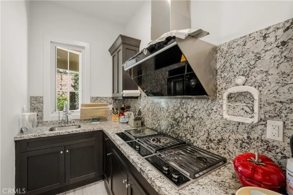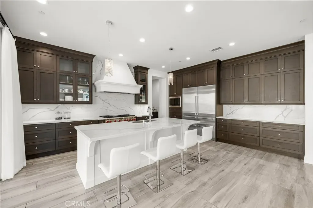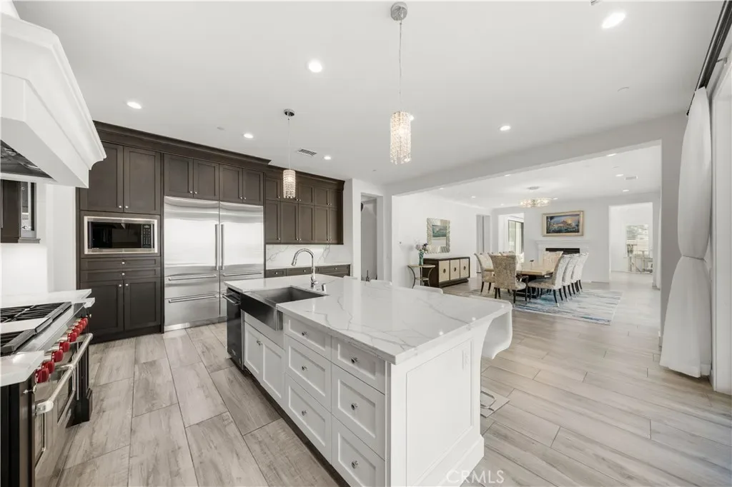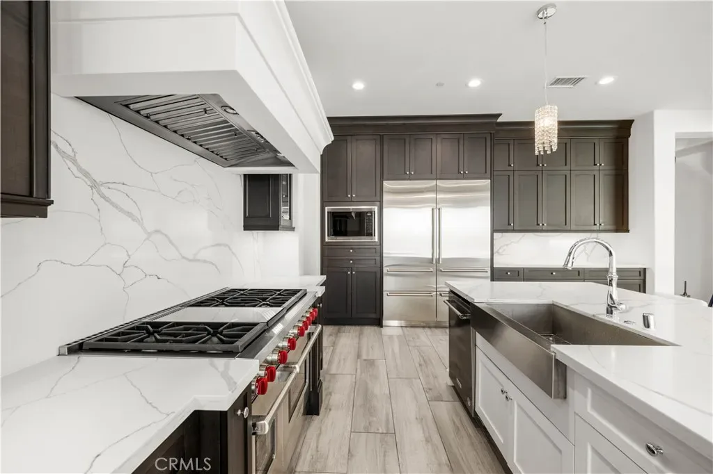 The gourmet chef’s kitchen is outfitted with a generous quartz center island, full designer backsplashes, a Wolf 6-burner range, dual Sub-Zero refrigerators, and a dedicated prep kitchen. The main level also features a private en-suite bedroom and an oversized 4-car garage.
