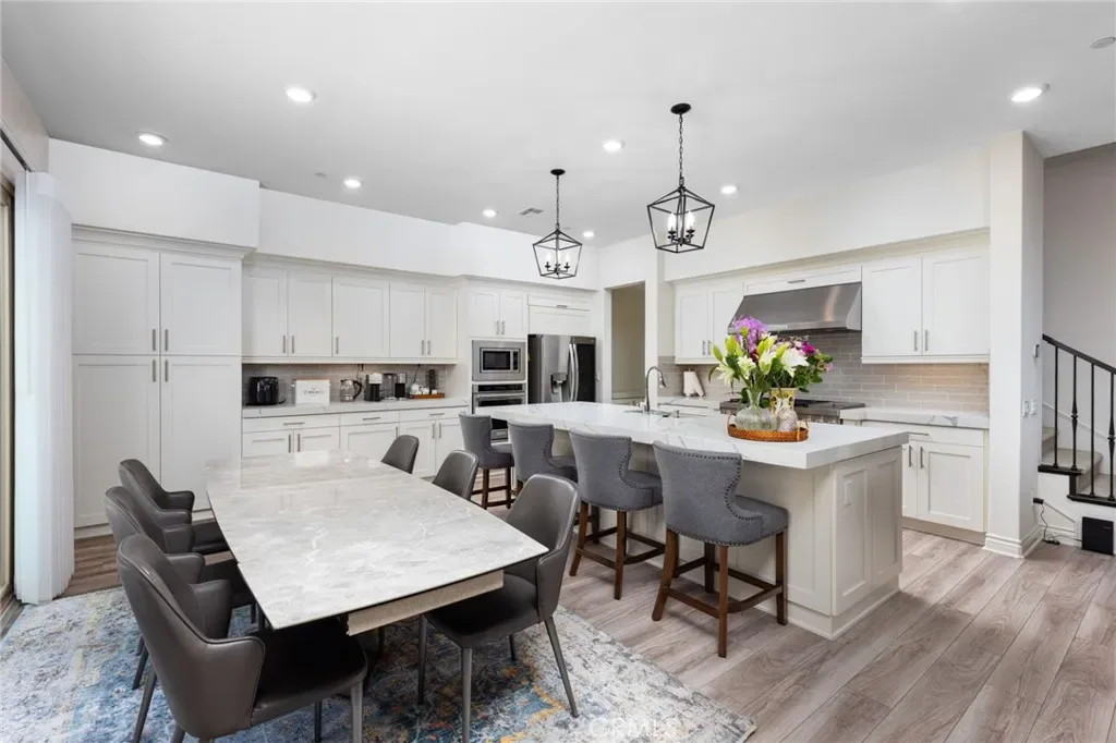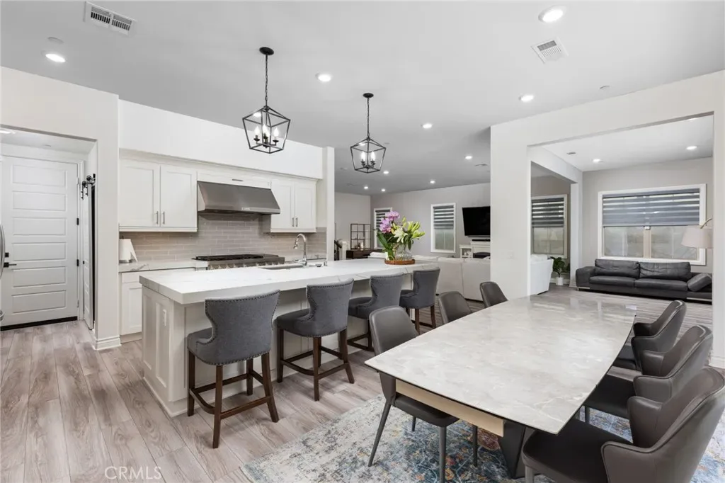 Designed for modern living and entertaining, the open-concept floor plan showcases a gourmet chef’s kitchen appointed with KitchenAid appliances, a 6-burner cooktop and three ovens, cultured marble countertops, an oversized island, farmhouse sink, pendant lighting, and upgraded cabinetry with full-height tile backsplash. Luxury vinyl plank flooring enhances the main living areas, while expansive panoramic sliding doors create seamless indoor-outdoor flow to the oversized designer backyard, perfect for entertaining and al fresco dining.