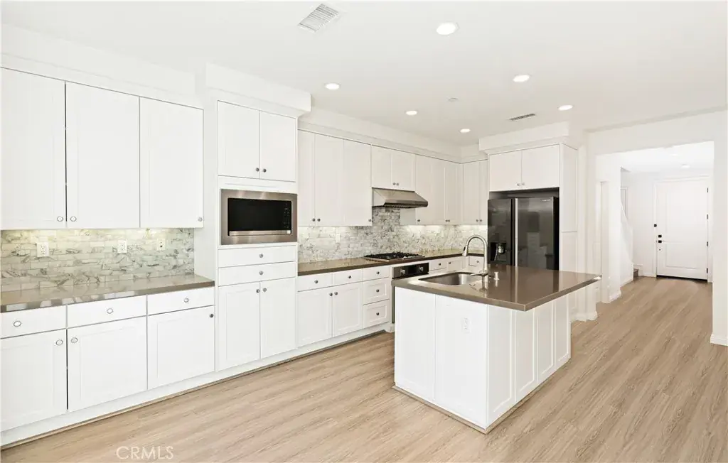 Laminate flooring flows throughout the home, offering a warm and cohesive aesthetic that enhances both comfort and style. The fully upgraded kitchen showcases a stylish backsplash and premium Bosch stainless-steel appliances — a perfect blend of form and function for everyday living and entertaining. Recessed lighting throughout the home creates a bright and modern ambiance in all primary living spaces. Upstairs, you’ll find three bright and airy bedrooms that offer comfort, and natural light throughout the day. The attached 2 car garage features epoxy flooring, lending a polished and practical touch for vehicles and storage. Energy-efficient solar panels are installed to help lower monthly utility costs, reinforcing the home’s sustainable appeal. The home also features a sunny backyard, perfect for relaxing, outdoor dining, or weekend gatherings.