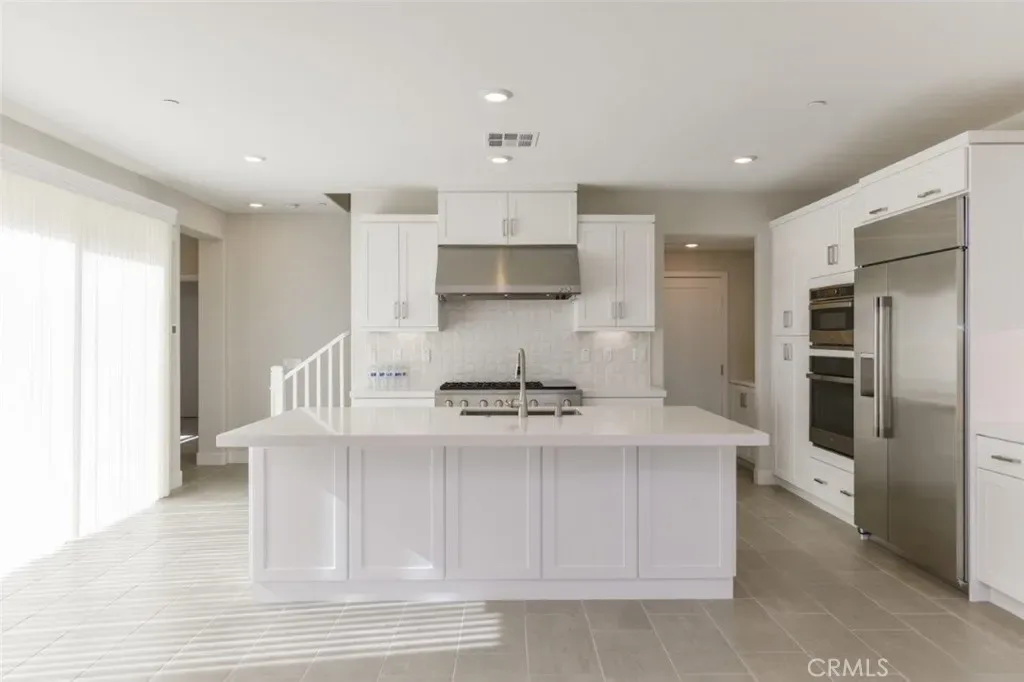 The open-concept floor plan is filled with natural light and thoughtfully designed for both everyday living and entertaining. The gourmet chef’s kitchen features premium stainless steel appliances, a large center island, designer backsplash, built-in refrigerator, and abundant cabinetry—perfect for hosting gatherings or enjoying family meals. The spacious living and dining areas flow seamlessly together, creating a warm and inviting atmosphere.