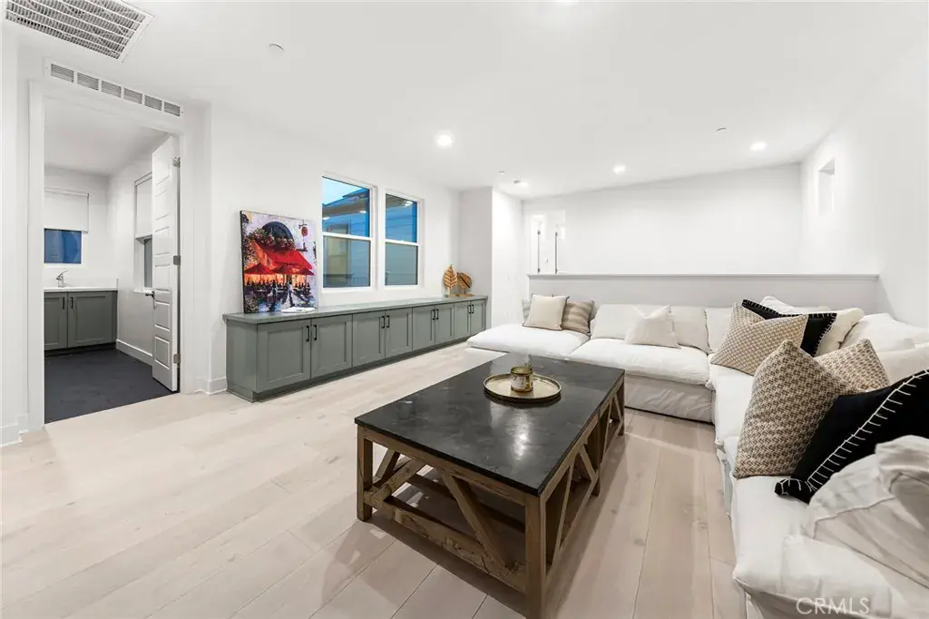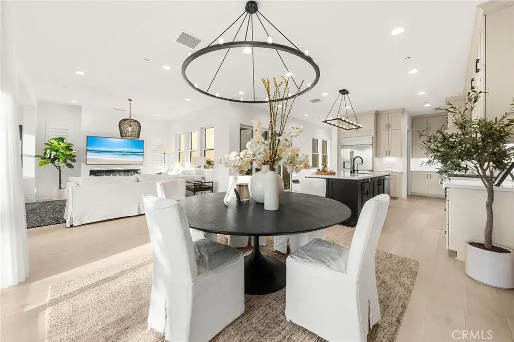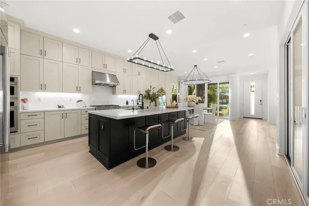 The kitchen flows seamlessly into the dining and living spaces, highlighted by designer lighting and soft natural tones. When the sliding doors open,the indoor and outdoor spaces merge effortlessly, revealing a tranquil central side courtyard that connects every corner of the home with nature — perfect for al fresco dining or quiet evenings under the California sky.
