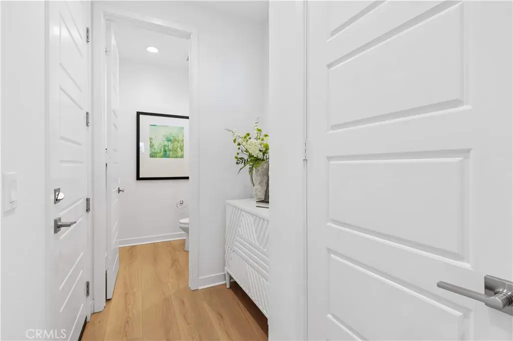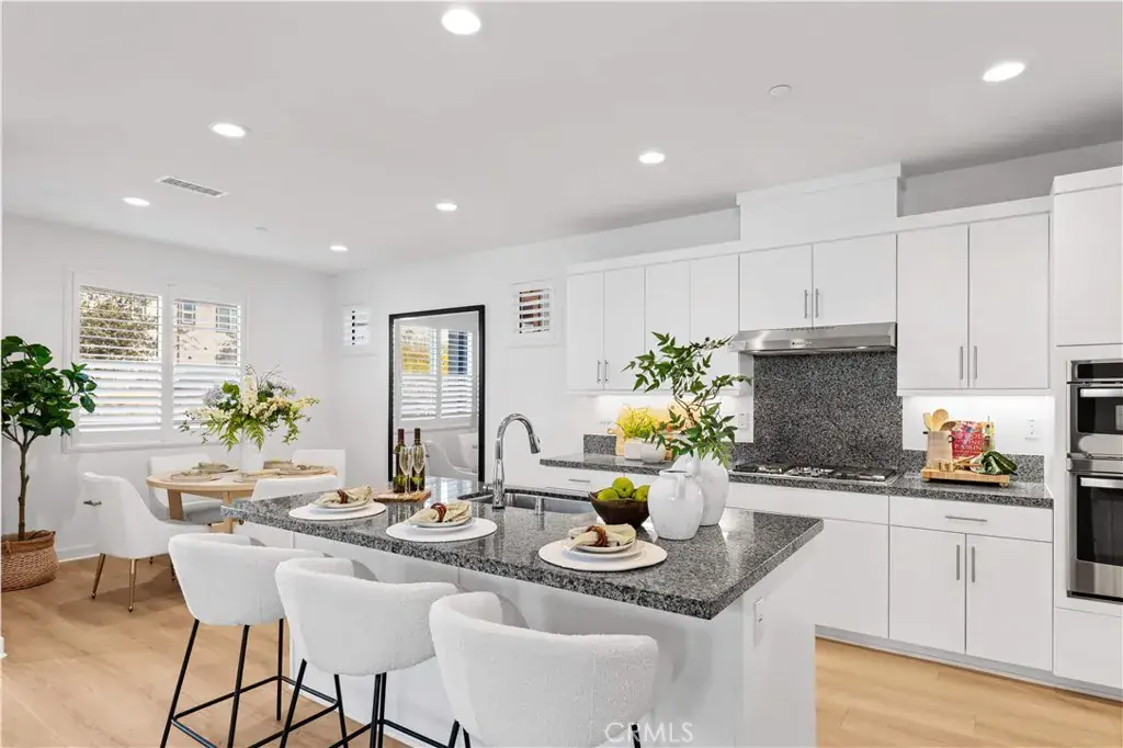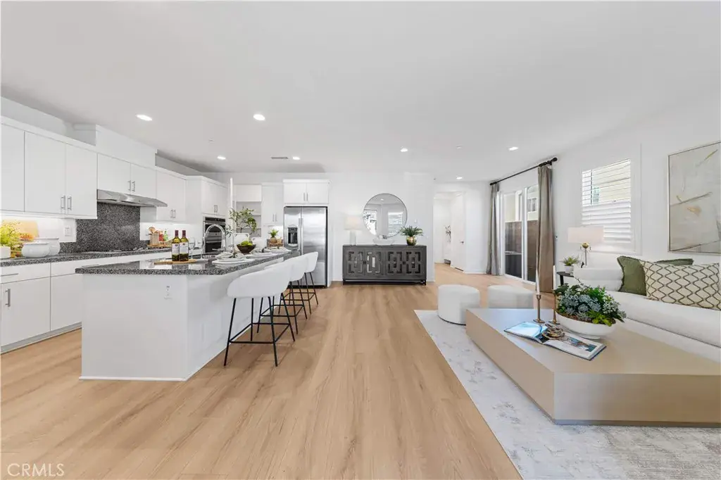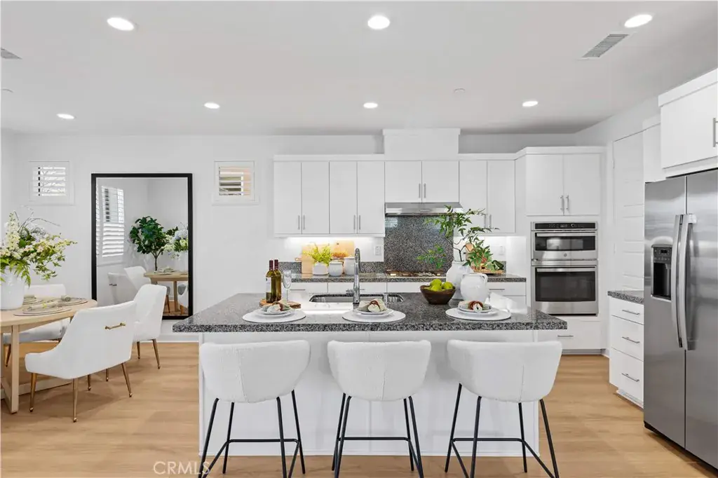 This stunning corner-lot detached home features the highly desirable Plan 1 of Aer in Solis Park at the Great Park Neighborhoods. Offering 3 bedrooms, 2.5 bathrooms, and a versatile tech loft, the home blends modern design with practical functionality in a thoughtfully planned layout. The open-concept main level is filled with natural light, highlighted by high ceilings, expansive windows, and sliding glass doors that create a bright and welcoming living environment. The chef-inspired kitchen serves as the heart of the home, featuring an oversized center island, granite countertops, stainless steel appliances, and a spacious walk-in pantry—ideal for both everyday living and entertaining. Luxury vinyl plank flooring runs throughout the entire home and is complemented by upgraded recessed lighting throughout, while the first floor also includes a powder room and a convenient built-in wardrobe area near the garage entry.