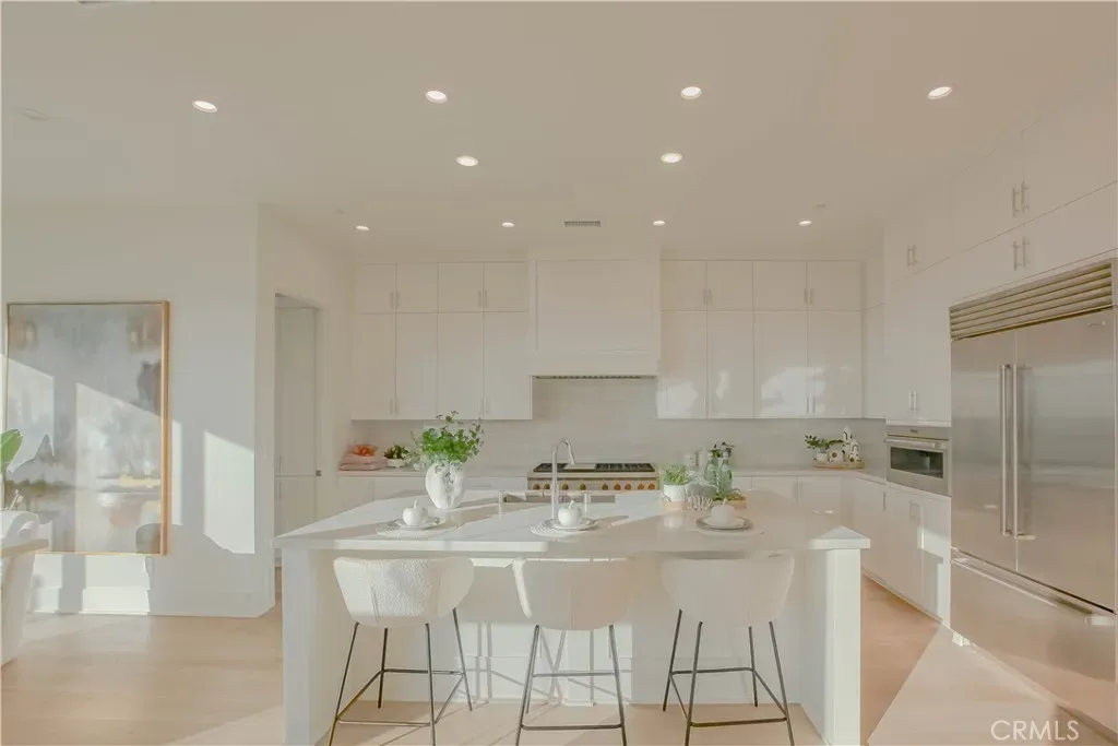 The first floor of the villa is designed to maximize both comfort and aesthetics. The open-concept living room, dining area, and kitchen create a seamless flow, perfect for both relaxation and entertainment. Large floor-to-ceiling windows flood the space with natural light, offering an unobstructed view of the cityscape and mesmerizing sunsets. Whether enjoying a quiet evening with family or hosting guests, the ambiance is nothing short of spectacular. At dusk, residents can gaze out over the New Port coastline and Fashion Island, while at night, they can take in the dazzling city lights from master bedroom.